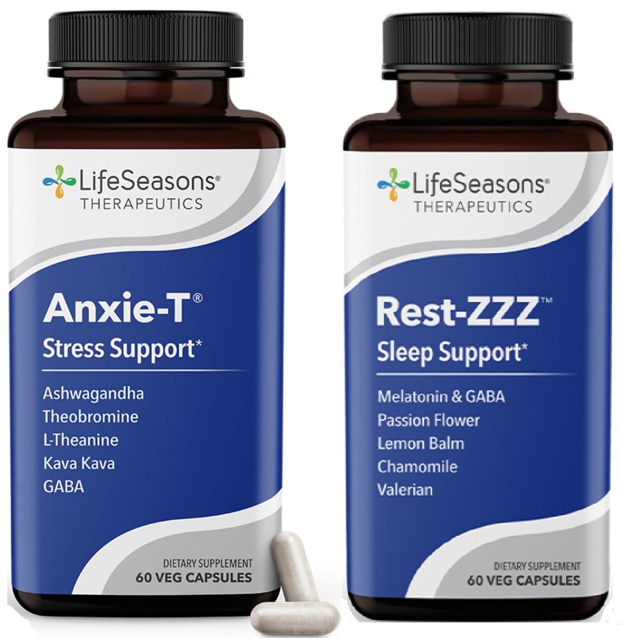 One Unique Blend - Achieving a change in health requires the right ingredients in the right doses. This used to require purchg many individual vitamins and nutrients to create an effective blend. LifeSeasons was doctor formulated to put that blend into one bottle. Day Night Support - Take two Anxie-T stress support supplements each morning, with or without food. Take two Rest-ZZZ 30 minutes before bed for 24 7 coverage. Effective - Most people experience the relaxing effects of Anxie-T the first day they take it, often within 30 minutes. It usually induces a feeling of calm, and won't make you feel tired. Clinically Tested Ingredients - Crafted with all natural ingredients such as Ashwagandha, Kava Kava, L-theanine, and Theobromine that all work together. We even use a neurotransmitter called GABA. Its primary role in the body is thought to be the inhibition of nerve excitability. Health Benefits - Anxie-T with Rest-ZZZ supports the body's natural ability to deal with common symptoms of stress, including nervousness and nervous exhaustion, stress-related muscle tension, and stress-related sleep problems.