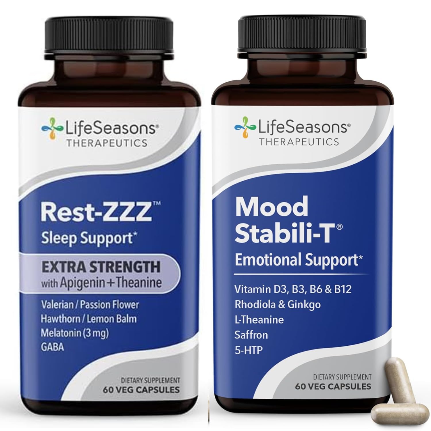 Support deep, restorative sleep and balanced mood with the LifeSeasons Rest-ZZZ Extra Strength Mood Stabili-T Bundle. Rest-ZZZ Extra Strength is designed to help you fall asleep naturally, stay asleep, and wake refreshed. This gentle, plant-based formula combines Valerian, Passion Flower, Chamomile, and a low dose of Melatonin with naturally occurring neurotransmitters to calm the nervous system, ease muscle tension, and reduce restlessness—making it ideal for those sensitive to higher melatonin levels. Simply take two capsules 20–30 minutes before bed as part of your nighttime wind-down routine. Mood Stabili-T helps promote a consistently balanced, happy, and calm mood. Formulated with Rhodiola, Ginkgo Biloba, Vitamin D3, and other targeted ingredients, it supports emotional well-being, mental clarity, and stress resilience. With consistent daily use, many experience improved mood stability within weeks. Together, these formulas provide day-and-night support—helping you feel calm, rested, and emotionally balanced every day.One Unique Blend - Achieving a change in health requires the right ingredients in the right doses. This used to require purchg many individual vitamins and nutrients to create an effective blend. LifeSeasons was created to put that blend into one bottle. Helps With Mood: Results with Mood Stabili-T may be felt in the first days or weeks. When used consistently for 4 or more weeks, a more consistently balanced, happy, and calm mood is experienced. Everyone is different, and results will vary from person to person. The key is to maintain consistent use every day to see best results. Helps Create Calmness: Mood Stabili-T supports a feeling of calmness and emotional well-being. Our formula stabilizes and balances mood by promoting healthy neurotransmission. It also promotes proper blood flow. Clinically Tested Ingredients - Crafted with clinically tested ingredients, Rest-ZZZ contains GABA, Melatonin, Valerian, Passion Flower, Chamomile, and additional ingredients to support the body's natural ability to feel calm, sleepy, and relaxed. Health Benefits - Rest-ZZZ Extra Strength introduces the powerful ingredient Apigenin combined with 2 more miligrams of melatonin compared to Rest-ZZZ original. This is a natural sleep support supplement that helps lessen muscle tension, restlessness, and nerve-related sleeplessness by calming the nervous system without leaving you with a groggy feeling the next morning.