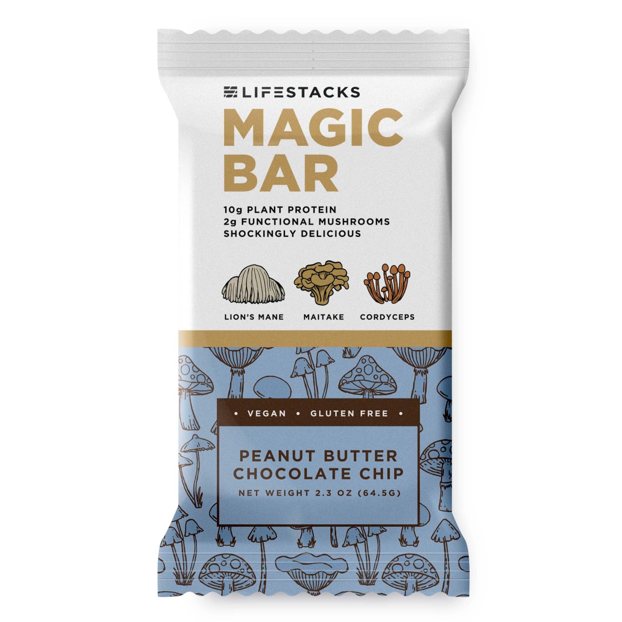 Lifestacks Magic Bar Superfood Snack with 2g Functional Mushrooms 10g Plant Based Protein & 4g Fiber Vegan Gluten Free Nutrient Dense Peanut Butter Energy Bar 6 Pack (Chocolate Chip) Peanut Butter Chocolate