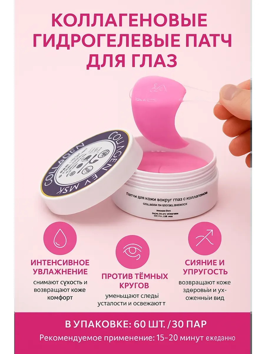 Гидрогелевые патчи с коллагеном — это незаменимое средство для ухода за нежной кожей вокруг глаз. Они помогают быстро устранить следы усталости, убрать отёки и тёмные круги, а также вернуть коже свежий и ухоженный вид. Благодаря содержанию коллагена, патчи активно питают и укрепляют кожу, способствуют повышению её упругости и эластичности, разглаживают мелкие морщинки и предупреждают появление новых. Гелевая текстура мягко охлаждает и дарит ощущение комфорта, а розовый цвет патчей делает процедуру ещё более приятной и эстетичной. Всего за 15–20 минут кожа вокруг глаз становится увлажнённой, гладкой и сияющей. Удобная упаковка содержит 60 штук (30 пар), что обеспечивает полный курс ухода. Подходят для ежедневного применения и для всех типов кожи, особенно рекомендуются при признаках усталости и обезвоженности. С патчами с коллагеном твой взгляд всегда будет свежим, молодым и привлекательным!