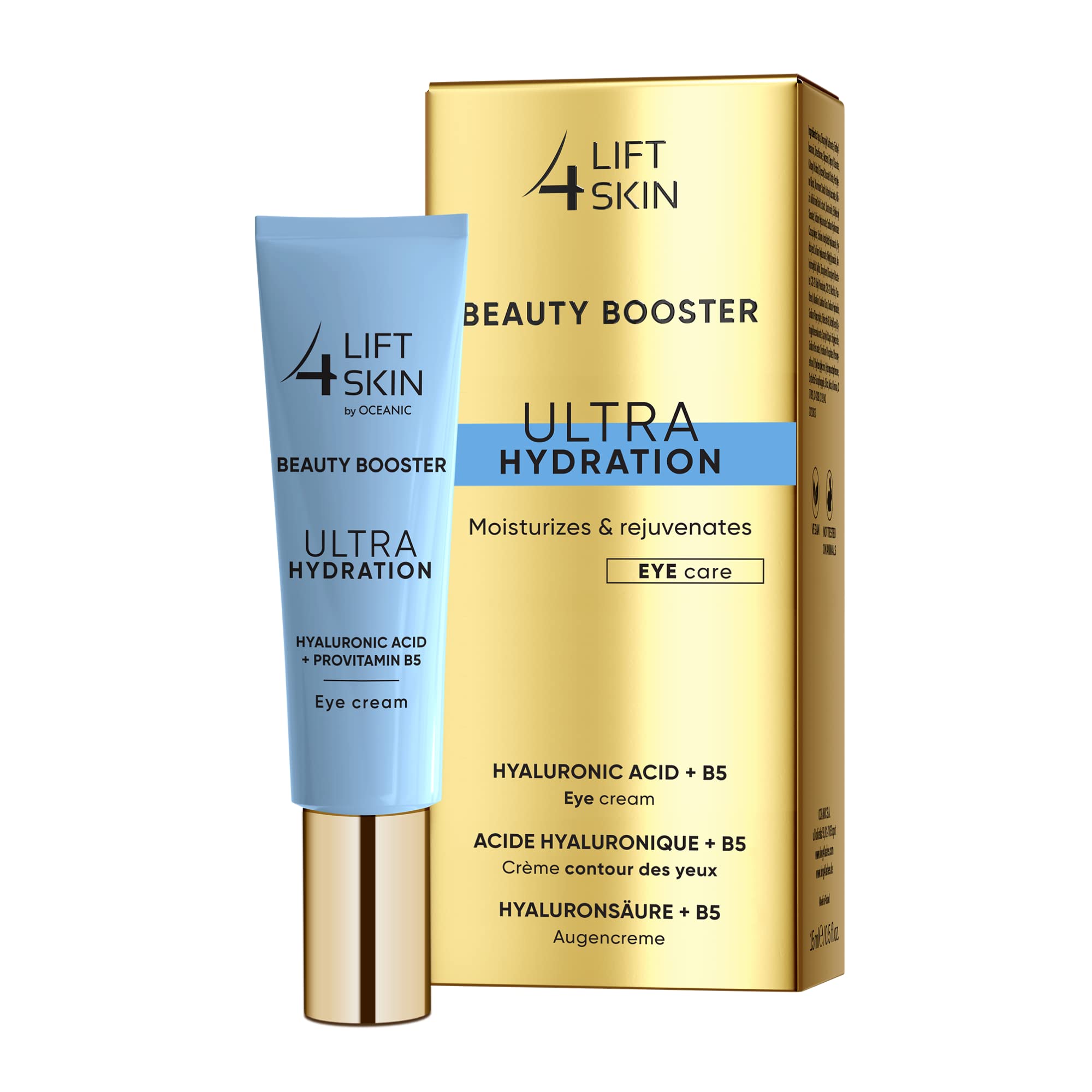 The cream is based on the connection of an ultra dose of two hyaluronic acid species, which form a three-dimensional network on the skin and ensure exceptionally high protection against water loss.Networked hyaluronic acid reduces the number and depth of the wrinkles and improves the elasticity of the skin around the eye area.It levels swelling under the eyes.Unlocated hyaluronic acid donates intensively and long -lasting moisture.It strengthens the skin and paves its structure.Provitamin B5 relieves irritation and gives the skin silky smoothness and softness. Ingredients ingredients Aqua, dicaprylyl carbonate, triethylhexanoin, dimethicone, glycerin, glycery stearate, cetearyl alcohol, glycery stearate citrate, pentylene glycol, aluminum star, albizia JuliBrissin bark extract, darutoside, soda Hyaluronates, sodium hyaluronates cross polymer, sodium acetylated hyaluronates, hydrolyzedSodium hyaluronates, xylitylglucosides, anhydroxylitol, xylitol, tocopherol, tocopheryl acetate, C20-22 alkyl phosphate, C20-22 alcohols, panthenol, allantoin, xanthan hydroxides, sodium polyacrylate Identalonations, Caprylic Capric Triglyceride,Sodium benzoate, disodium phosphate, phenoxyethanol, ethylhexylglycerin, hydroxyacetophenone, synthetic fluorphlogopite, silica, mica, alumina, CI 77891, CI 42090.provitamin B5.Ultra dose of two hyaluronic acid species.Eyes and eyelids.Die Creme basiert auf der Verbindung einer Ultra-Dosis von zwei Hyaluronsäurearten, die auf der Haut ein dreidimensionales Netz bilden und einen außergewöhnlich hohen Schutz vor Wasserverlust gewährleisten. Vernetzte Hyaluronsäure mindert die Anzahl sowie Tiefe der Falten und verbessert die Elastizität der Haut um die Augenpartie. Sie nivelliert Schwellungen unter den Augen. Unvernetzte Hyaluronsäure spendet intensiv und langanhaltend Feuchtigkeit. Sie festigt die Haut und ebnet ihre Struktur. Provitamin B5 lindert Reizungen und verleiht der Haut seidige Glätte und Weichheit. INHALTSSTOFFE ZUTATEN Aqua, Dicaprylyl Carbonate, Triethylhexanoin, Dimethicone, Glycerin, Glyceryl Stearate, Cetearyl Alcohol, Glyceryl Stearate Citrate, Pentylene Glycol, Aluminum Starch Octenylsuccinate, Albizia Julibrissin Bark Extract, Darutoside, Ethylhexyl Stearate, Sodium Hyaluronate, Sodium Hyaluronate Crosspolymer, Sodium Acetylated Hyaluronate, Hydrolyzed Sodium Hyaluronate, Xylitylglucoside, Anhydroxylitol, Xylitol, Tocopherol, Tocopheryl Acetate, C20-22 Alkyl Phosphate, C20-22 Alcohols, Panthenol, Allantoin, Xanthan Gum, Sodium Hydroxide, Sodium Polyacrylate, Trideceth-6, Diethylhexyl Syringylidenemalonate, Caprylic Capric Triglyceride, Sodium Benzoate, Disodium Phosphate, Phenoxyethanol, Ethylhexylglycerin, Hydroxyacetophenone, Synthetic Fluorphlogopite, Silica, Mica, Alumina, CI 77891, CI 42090, CI 19140.Provitamin B5. Ultra-Dosis von zwei Hyaluronsäurearten. Augen und Augenlider.Lift4Skin BEAUTY BOOSTER ULTRA HYDRATION Creme für Augen und Augenlider 15 ml