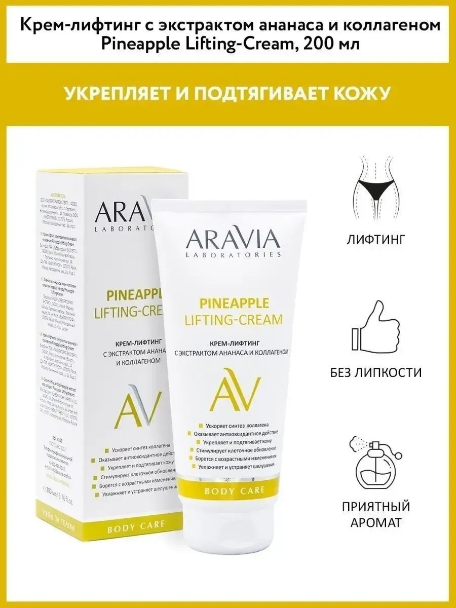 Увлажняющий крем для тела с выраженным лифтинг-эффектом. Мгновенно подтягивает кожу, устраняет шелушения и стянутость. Дарит длительное ощущение комфорта.- Коллаген и экстракт ананаса запускают клеточное обновление и улучшают эластичность кожи. Укрепляют и омолаживают кожу. - Натуральные масла ши, какао и оливы питают и смягчают кожу. Насыщены жирными кислотами и витаминами. Обладают антиоксидантным действием. Способ применения: нанесите крем на сухую чистую кожу тела до полного впитывания. Рекомендуется использовать ежедневно 1-2 раза в день.