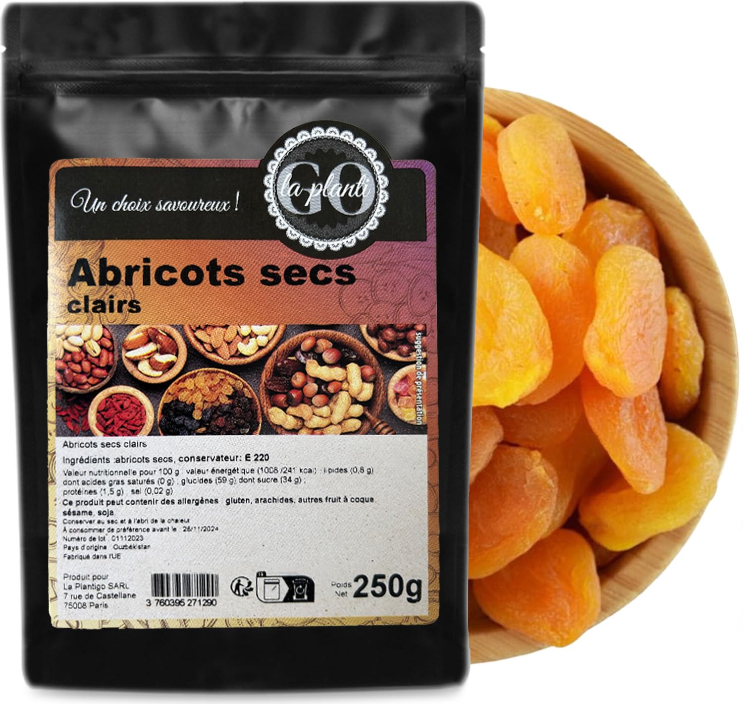 Ingredients : dried apricots, preservative: E220 Information on allergens: This product may contain allergens: gluten, peanuts, nuts, sesame, soy. Nutritional value per 100g: Energy value- 1008 kJ 241 kcal Lipids-0.8 g Of which saturated fatty acids - 0 g Carbohydrates- 59 g Including sugar - 34 g Protein – 1.5 g Salt-0.02 g Nutritional values were calculated from database and raw material specifications. Individual batches may vary slightly. Packaging method: The product is packaged in thick "doypack" type bags. The package has a welded drawstring closure, which allows easy opening and closing multiple times. Thanks to this simple technology, the product maintains its freshness. Its organoleptic properties do not change during the entire shelf life. Thanks to high sales volumes and the rotation of our stocks, LA PLANTIGO products are always fresh, which encourages bulk purchases and the storage of food in the pantry at home. INGREDIENTS dried apricots, preservative: E220They are also rich in beta-carotene (vitamin A), which is responsible for their color and protects the body from free radicals. Vitamin A thus helps fight premature skin aging. It is worth mentioning that dried apricots consumed in large quantities can have a laxative effect. For people with digestive disorders, we recommend taking only a small amount before meals. Dried apricots - calories and properties 100 grams of dried product have an energy value of 241 kcal. Dried apricots contain microelements: calcium, iron, and phosphorus. They are also a source of vitamins E, B1, and B2. High fiber and pectin contents enrich and improve the nutritional value of dishes containing dried apricots. Their large, economical packaging will allow you to enjoy your favorite snack for a long time while preserving the freshness and olfactory qualities of the product. Using Dried Apricots in Cooking Whole dried apricots are a great idea for a healthy snack between meals. Diced or cut into small pieces, they can be added to cakes, yogurts, or homemade mueslis. Dried apricots are the sweet, orange fruits of the apricot tree that have undergone a drying process. Thanks to their color and juicy flavor, they delight not only the taste buds but also the stomach. An interesting snack to munch on rather than a candy. Ingrédients : abricots secs, conservateur : E220 Information sur allergènes : Ce produit peut contenir les allergènes : gluten, arachides, fruit à coque, sésame, soja. Valeur nutritionnelle pour 100g: Valeur énergétique- 1008 kJ 241 kcal Lipides-0,8 g Dont acides gras saturés-0 g Glucides- 59 g Dont sucre- 34 g Protéines – 1,5 g Sel-0,02 g Les valeurs nutritionnelles ont été calculées à partir de base de données et spécifications de matières premières. Les lots individuels peuvent varier légèrement. Méthode d'emballage : Le produit est emballé dans des sachets épais de type « doypack ». L'emballage a une fermeture à cordon soudé, ce qui permet l'ouverture et la fermeture facile plusieurs fois. Grâce à cette technologie simple le produit garde sa fraicheur. Ses propriétés organoleptiques ne changent pas pendant toute la durée de conservation. Grâce aux volumes de ventes important et la rotation de nos stocks, les produits LA PLANTIGO sont toujours frais, ce qui favorise les achats en gros et le stockage des aliments dans le garde-manger à la maison. INGRÉDIENTS abricots secs, conservateur : E220Ils sont aussi riches en bêta-carotène (vitamine A), qui est à l'origine de leur couleur et qui protège l'organisme des radicaux libres. La vitamine A contribue ainsi à lutter contre le vieillissement prématuré de la peau. Il convient de mentionner que les abricots secs consommés en grande quantité peuvent avoir un effet laxatif. Aux personnes souffrant de troubles du système digestif, nous recommandons de n'en prendre qu'une petite quantité avant les repas. Abricots secs - calories et propriétés 100 grammes de produit séché représentent une valeur énergétique de 241 kcal. Les abricots secs contiennent des microéléments : calcium, fer et phosphore. Ils sont également une source de vitamines E, B1 et B2. Des teneurs importantes en fibres et en pectine enrichissent et améliorent la valeur nutritionnelle des plats contenant des abricots secs. Leur grand emballage économique vous permettra de profiter longtemps de votre en-cas préféré tout en conservant la fraîcheur et les qualités olfa-gustatives du produit. Utilisation des abricots secs en cuisine Les abricots secs entiers sont une excellente idée pour consommer un en-cas sain entre les repas. Coupés en dés ou en petits morceaux, ils peuvent être ajoutés à des gâteaux, yaourts ou mueslis maison. Les abricots secs sont les fruits orange et sucrés de l'abricotier, soumis au processus de séchage. Grâce à leur couleur et à leur goût juteux, ils ravissent non seulement les papilles mais aussi l'estomac. Un en-cas intéressant à croquer plutôt qu'un bonbon.