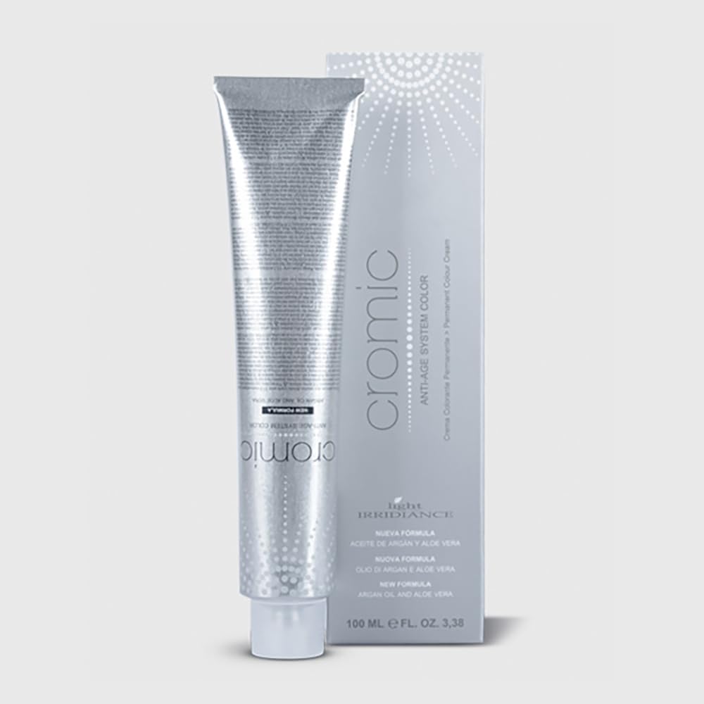 Cromic Hair Color - Light Irridiance 4.3 - Golden Brown Cromic is an oxidative hair color with unique performance: - Total Coverage Intense Highlights The use of high-quality color pigments allows for total gray coverage, for a uniform and long-lasting result, with intense and luminous highlights. - Anti-Aging System Developed with an anti-aging formula, Cromic hair color has strong nourishing, regenerating, and protective properties for the hair fiber. The hair is respected and its structure preserved. - Enriched with Argan Oil Aloe Vera Its exclusive formula based on argan oil and aloe vera gives Cromic moisturizing, antioxidant, and soothing properties. The hair is hydrated, luminous, and lastingly strengthened. Application Method: Mix 1:1.5 with a processing time of 20 to 40 minutes depending on the volume of developer used
