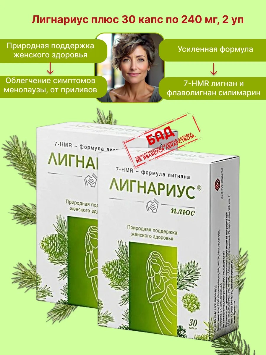 Лигнариус плюс - биологически активная добавка к пище, которая содержит запатентованную формулу лигнана, выделенную из сучков ели европейской (Picea Abies), содержащей максимальное количество лигнана 7-HMR (7-гидроксиматаирезинол), оказывающего положительный эффект на общее состояние женского организма в период перименопаузы и постменопаузы. В Лигнариус плюс добавлен флаволигнан силимарин, который усиливает действие 7-HMR лигнана и обеспечивает защиту женского организма от оксидативного стресса, замедляет процессы старения, снижает риск развития атеросклероза и сердечно-сосудистых заболеваний, обладает активным гепатопротекторным действием, оказывает положительный эффект на гликемический профиль, способствует поддержанию нормального веса. Поддерживает баланс женских гормонов, сохраняя женскую красоту и привлекательность изнутри в период климакса.