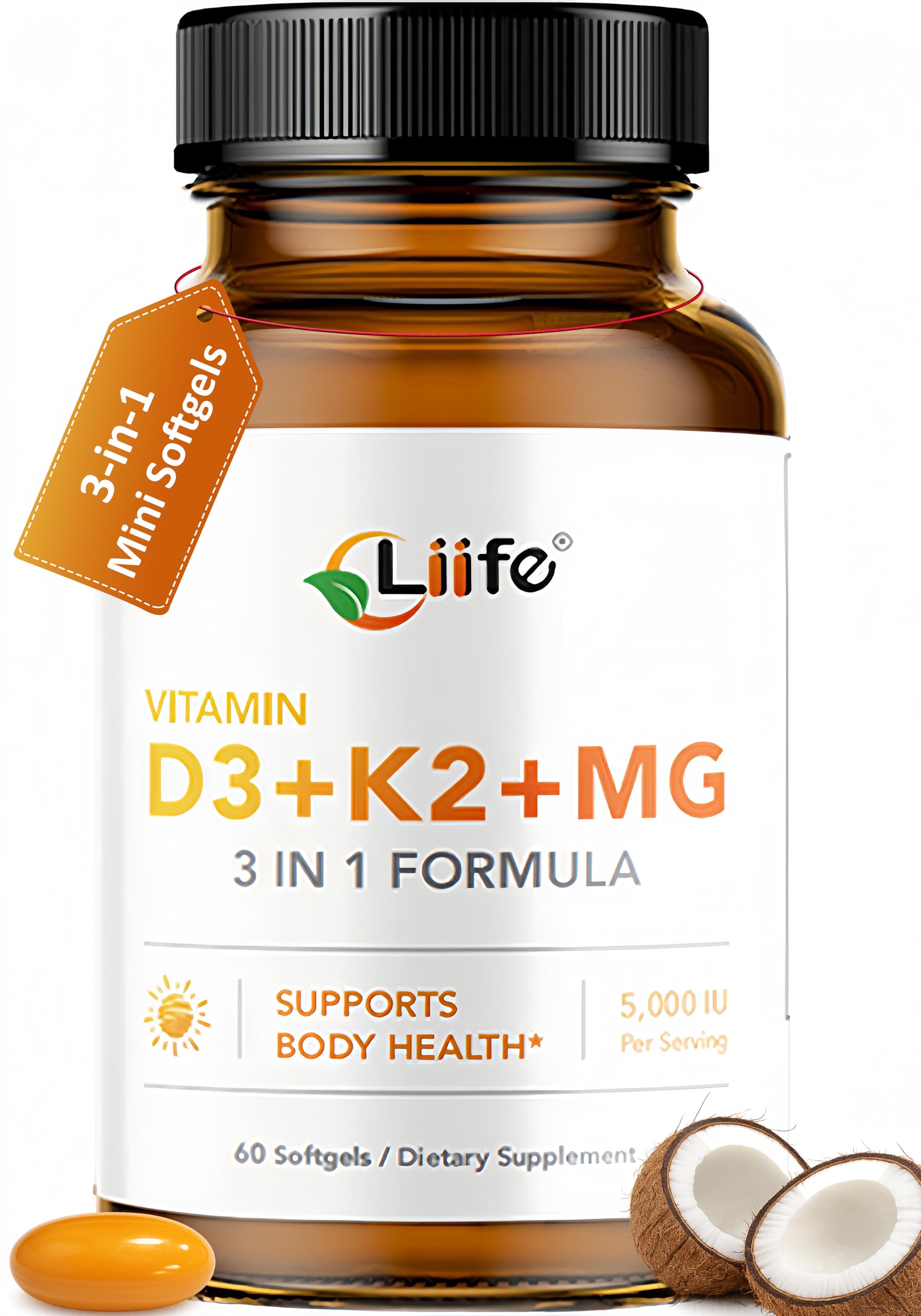 High-Dose 30-Day Supply: Convenient Nutrition 2 capsules day meet 625 DV D3 167 DV K2. 60 capsules (30-day supply) with portable packaging—ideal for office workers sun-protection users. No unnecessary additives, pure reliable. Exceptional Quality, Purity Verified, Gentle Formula: Manufactured in a U.S. GMP-certified facility under strict quality standards. Free from GMOs, gluten, artificial colors, and preservatives. Pure and effective nutrient delivery—daily purity you can feel, trustworthiness you can rely on. Extra B6 Glycine Magnesium: All-in-One Wellness 3mg Vitamin B6 (nerve metabolism support) 200mg Glycine Magnesium (muscle relaxation). One bottle covers bone, nerve, and muscle health—unbeatable value. Coconut Oil Base Softgel: Gentle High Bioavailability Coconut oil matches D3 K2's fat-soluble traits for better absorption. Easy-to-swallow softgel minimizes stomach irritation—effortless daily use for all gut types, even long-term. This synergistic Vitamin D3, K2 Magnesium formula: D3 boosts calcium absorption, K2 directs calcium to bones teeth, Magnesium activates D3. Infused with natural coconut oil and 200 mg Magnesium, it enhances fat-soluble nutrient absorption without extra fat, supporting daily wellness energy. Dual-Form K2 (MK4 MK7) D3: 2 capsules 5000IU D3 200mcg dual K2 (MK4: fast bone calcium deposition MK7: long-lasting vascular protection). Coconut oil (natural lipid carrier) enhances fat-soluble nutrient absorption—"instant sustained" support for bones vessels.