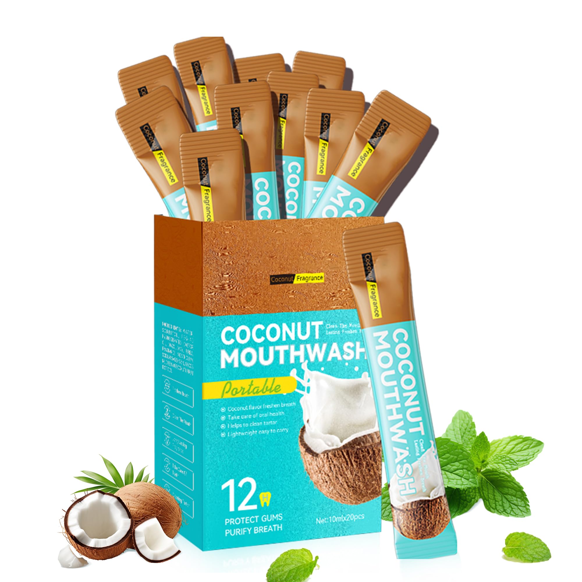 Convenient for All Occasions : Each sustainable paper box contains 20 sachets. Perfect for travel, cruise, work, dating or on-the-go.Simply carry them easily in your purse, bag, or suitcase for fresh breath and a clean mouth wherever you are. Long-Lasting Fresh Breath : Enjoy the refreshing combination of coconut and mint that not only freshens breath but also provides long-lasting odor protection. The natural ingredients work together to help keep your mouth clean and invigorated throughout the day. Effective Oral Care : Strengthens teeth and promotes healthy gums. This coconut mouthwash removes harmful bacteria, reduces plaque, and helps eliminate bad breath, leaving your mouth feeling fresh and clean all day. Alcohol-Free Fluoride-Free : Experience the gentle, alcohol-free formula that cleans your mouth without irritation. This fluoride free mouthwash is safe for sensitive teeth and gums, offering a soothing and refreshing clean. Travel Mouthwash Sachets : Perfect for on-the-go, this coconut oil mouthwash comes in convenient, single-use sachets. TSA compliant and mess-free, ideal for travel, work, or outdoor activities, these portable packets ensure you always have fresh breath and a clean mouth, no matter where you are.