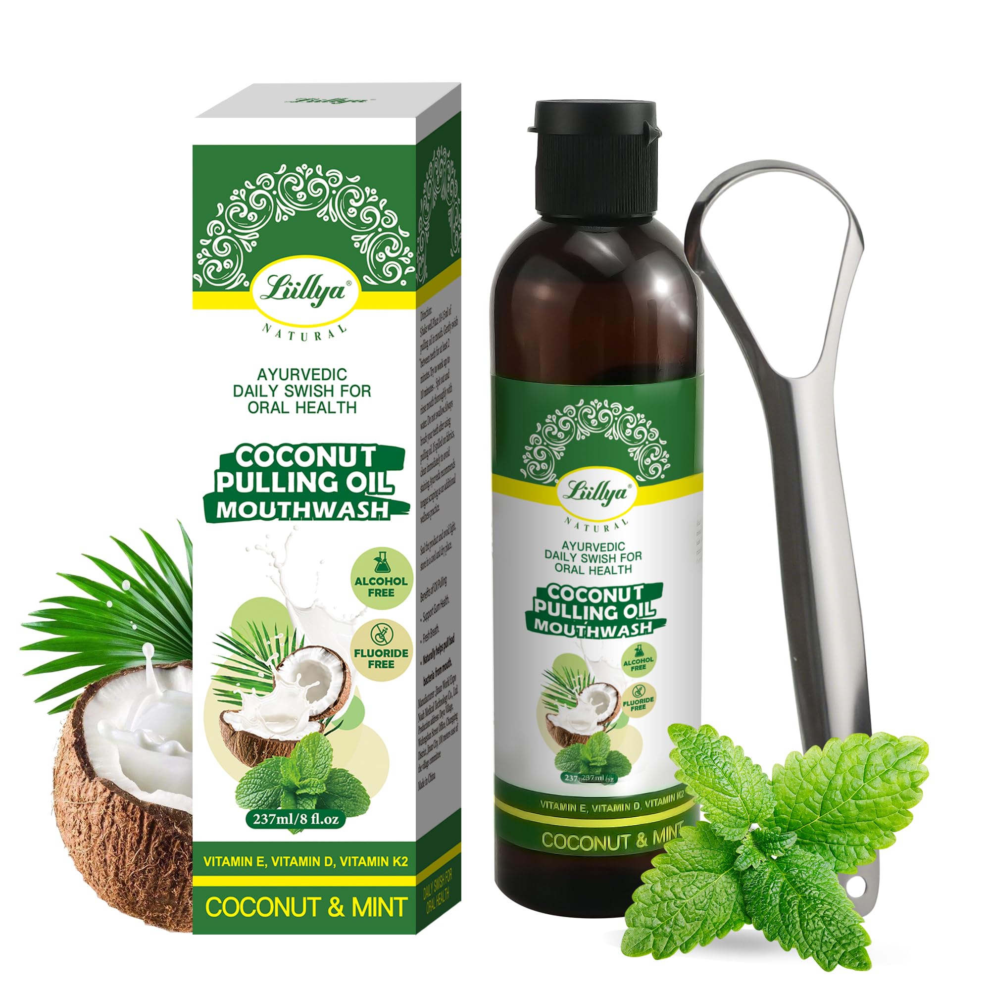 Convenient and Easy to Use : Pour 10-15ml into the included measuring cup, gently swish between teeth for 1-2 minutes, then rinse thoroughly and brush your teeth. The tongue scraper helps remove buildup for a cleaner, fresher mouth. A thoughtful gift to your oral care set. Fresh Breath Oral Hygiene : Effectively reduces plaque, freshens breath, and supports healthy teeth and gums. Great for those searching for a coconut oil mouthwash, alcohol-free mouth rinse, or oil pulling solution for daily oral hygiene. Pure and Safe Ingredients : 100 natural formula with no alcohol, no fluoride, no artificial colors or flavors, no parabens, and cruelty-free. This non-GMO coconut oil mouth rinse offers a safe, gentle alternative for natural and happy oral care routines. Full Mouth Care : Blended with coconut oil, peppermint oil, clove oil, tea tree oil, soybean oil, fennel oil, plus vitamins E, D, and K2, this plant-based formula helps freshen breath, soothe gums, reduce bad breath, and support gum strength. Natural Coconut Oil Pulling : Liillya coconut pulling oil uses a traditional Ayurvedic formula to support oral health and fresh breath. Perfect for daily oil pulling, this coconut oil mouthwash helps naturally clean your mouth and promote a healthier smile.