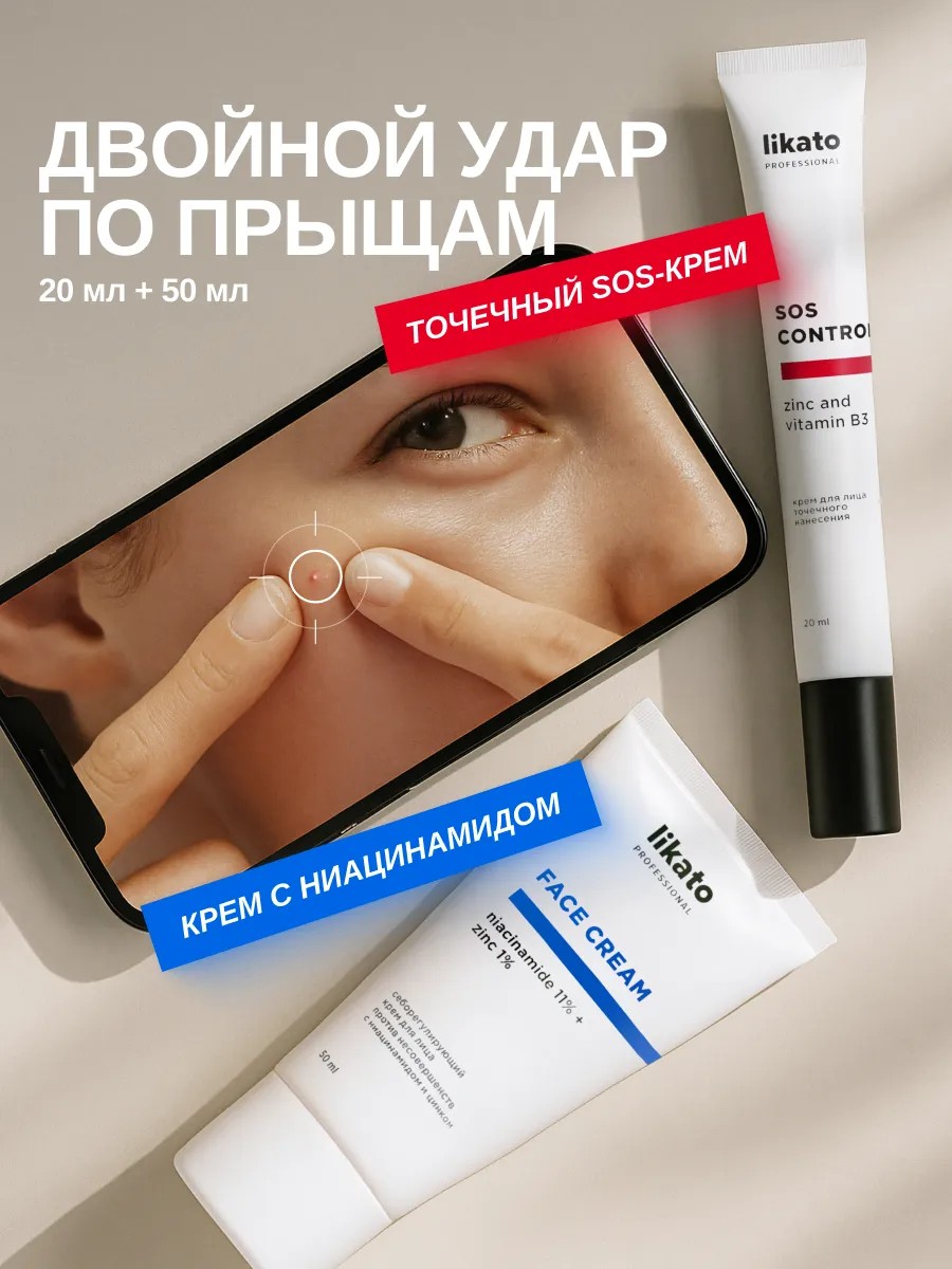 | Комплектация | Крем для лица точечного нанесения SOS CONTROL, 20 мл - 1 шт; Себорегулирующий крем для лица против несовершенств с ниацинамидом и цинком, 50 мл - 1 шт |