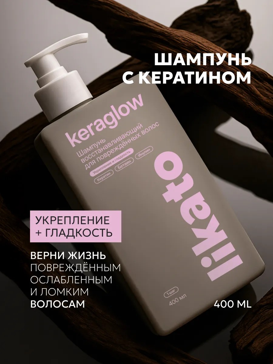 Формула шампуня для волос 400 мл разработана для тех, чьи локоны устали от фена, утюжков, окрашивания, но всё ещё хотят сиять. Кератин заполняет повреждённые участки, восстанавливая структуру волоса и делая его более плотным и гладким. Бетаин увлажняет и помогает удерживать влагу, предотвращая сухость и снижая ломкость. Инулин поддерживает здоровье кожи головы. Д-пантенол глубоко проникает в структуру волоса, укрепляя и возвращая блеск. Шампунь для волос женский подходит для всех типов волос: нормальных, пористых, тусклых, сухих и жирных волос, длинных и коротких, для волос с сединой, пушистых волос, и после ламинирования, кератинового выпрямления, химической завивки, осветления, прямых, кудрявых, вьющихся и окрашенных волос.