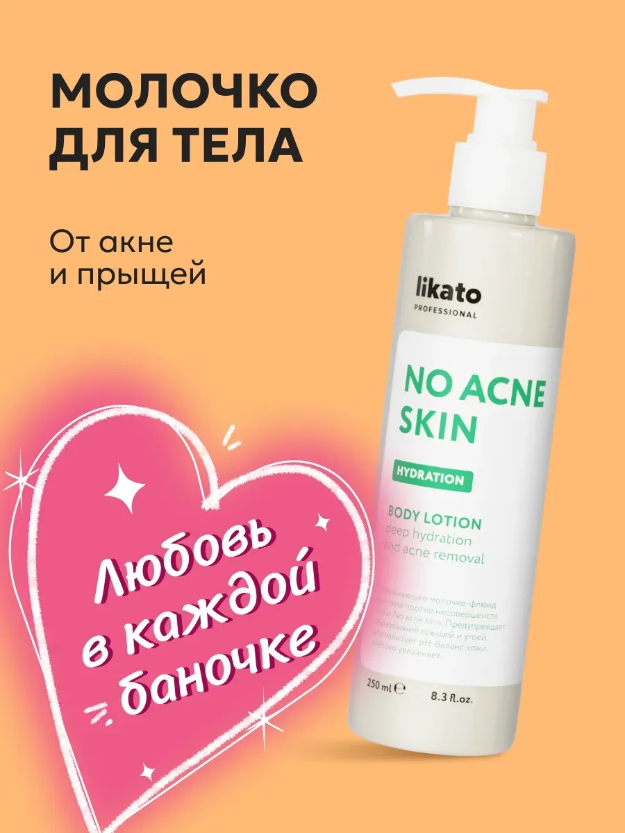 Молочко для тела от прыщей no acne skin от ликато – идеальное средство для ухода за кожей, склонной к акне и прыщам. Это уходовая профессиональная косметика от likato, созданная для нормализации работы сальных желёз и глубокого увлажнения кожи. Благодаря уникальному составу, молочко эффективно помогает от акне и против прыщей, делая твою кожу чистой и здоровой. Лосьон для тела содержит масло какао, которое смягчает и делает кожу упругой, а также серу, нормализующую выработку себума и избавляющую от прыщей. Мочевина удерживает влагу и интенсивно увлажняет кожу, а экстракты череды и шалфея успокаивают раздражения и нейтрализуют покраснения. Салициловая кислота отшелушивает кожу и подсушивает прыщики, способствуя их быстрому заживлению. Средство от прыщей увлажняет кожу, делая её бархатистой и мягкой. Благодаря невесомой, нежной текстуре крем для тела увлажняющий быстро впитываются, обеспечивая комфорт и удовольствие от использования. Молочко для тела увлажняющее станет отличным средством от прыщей для подростков, так как эффективно борется с прыщами и чёрными точками на спине и теле. Регулярное использование крема от прыщей и от чёрных точек позволяет поддерживать кожу в идеальном состоянии, молочко станет твоим надёжным помощником в уходе за кожей. Включив его в свой ежедневный ритуал ухода за телом, ты сможешь наслаждаться чистой, здоровой и бархатистой кожей каждый день! Попробуй молочко-крем от прыщей в наборе косметики уходовой вместе с гелем от прыщей из линейки no acne skin. Обеспечь своей коже максимальную заботу и нежный уход вместе с likato. Молочко от прыщей на спине может стать отличным подарком на 14 февраля, День всех влюблённых, День Святого Валентина, 8 Марта, день рождения, юбилей, годовщину, день матери, Новый год и Рождество любимой девушке, женщине, подруге, девочке, жене, бабушке, маме, сестре, начальнице, дочери, тёте, свекрови, тёще!