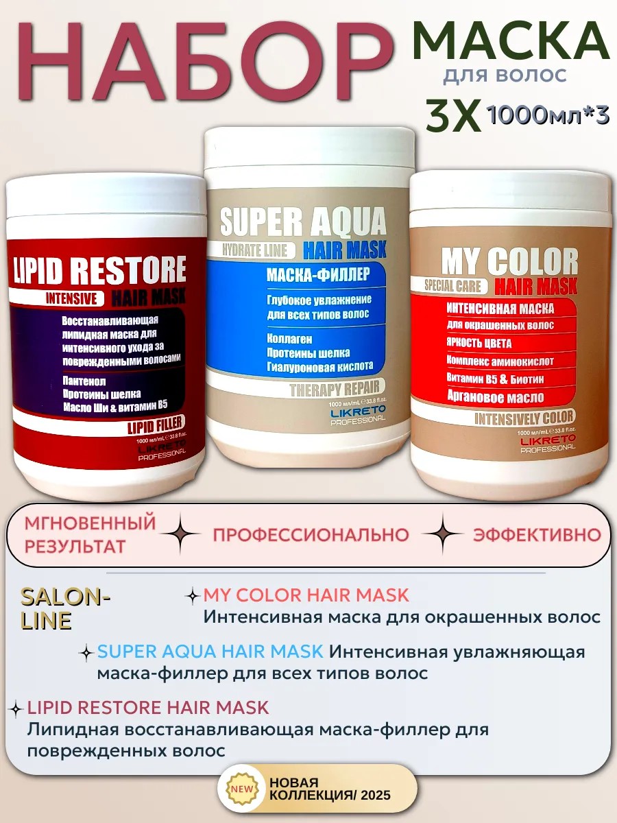 Представляем вам кератиновый набор маски для волос Super Aqua экстраувлажняющая, защитная маска Защита цвета My Color и LIPID Mask маска восстанавливающая с липидами из профессиональной серии, который обеспечит вашим волосам бережный уход и восстановление. Объем трех масок составляет 1000 мл каждая, что делает данный набор идеальным решением для интенсивного увлажнения и питания волос.