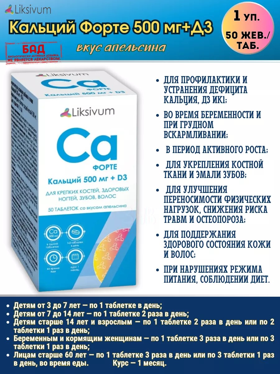 КомплектацияLiksivum Кальций Форте 500Мг +Д3 Таб Жев. N50 Втф * 1 уп.