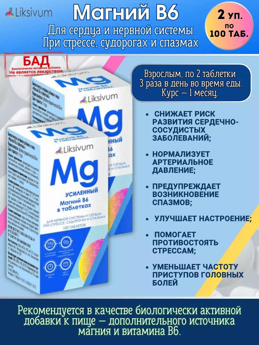 | Комплектация | Liksivum Магний В6 Таб Бан. N100 Втф * 2 уп |