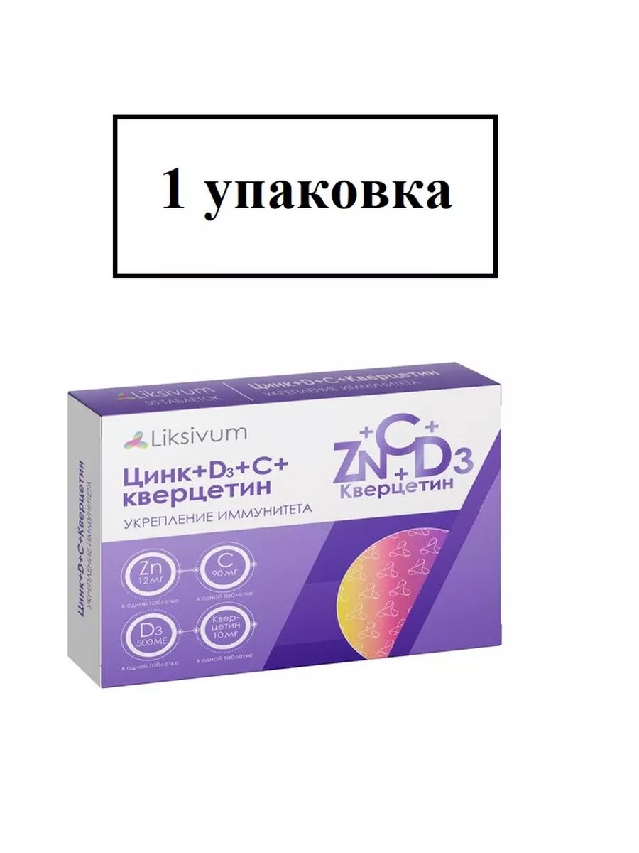 Цинк + D3 + С + кверцетин Liksivum - сочетание активных ингредиентов с выраженными антиоксидантными свойствами способствуют укреплению иммунитета, восстановлению защитных сил организма в период сезонных эпидемий гриппа и простуды. Усовершенствованная формула для усиления иммунной поддержки, снижения риска простудных и вирусных заболеваний. Витамин D и кверцетин способствуют улучшению функционального состояния бронхов и легких, показателей внешнего дыхания, укреплению стенок кровеносных сосудов и капилляров. - Содержание активных веществ в 1 таблетке: Витамин С 90 мг; Цинк 12 мг; Витамин Д3 500 МЕ; Кверцетин 10 мг. - Способ применения: взрослым и детям старше 14 лет принимать по 1 таблетке в день во время еды. Продолжительность приема - не менее 1 месяца. При необходимости курс приема можно повторять. Рекомендуется ежедневный прием в период сезонных эпидемий гриппа и простуды.