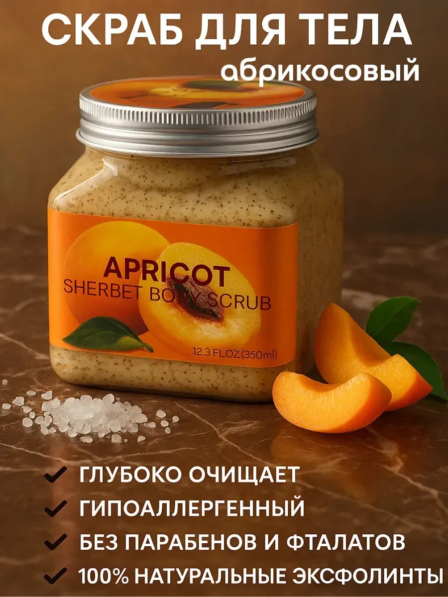 Натуральный абрикосовый скраб для тела ,антицеллюлитный солевой,парфюмированный с маслами,от растяжек отшелушивающий мягко и эффективно очищает кожу, удаляет ороговевшие клетки и способствует обновлению клеток. Благодаря мельчайшим отшелушивающим частицам и питательным компонентам, кожа становится гладкой, мягкой и сияющей уже после первого применения.