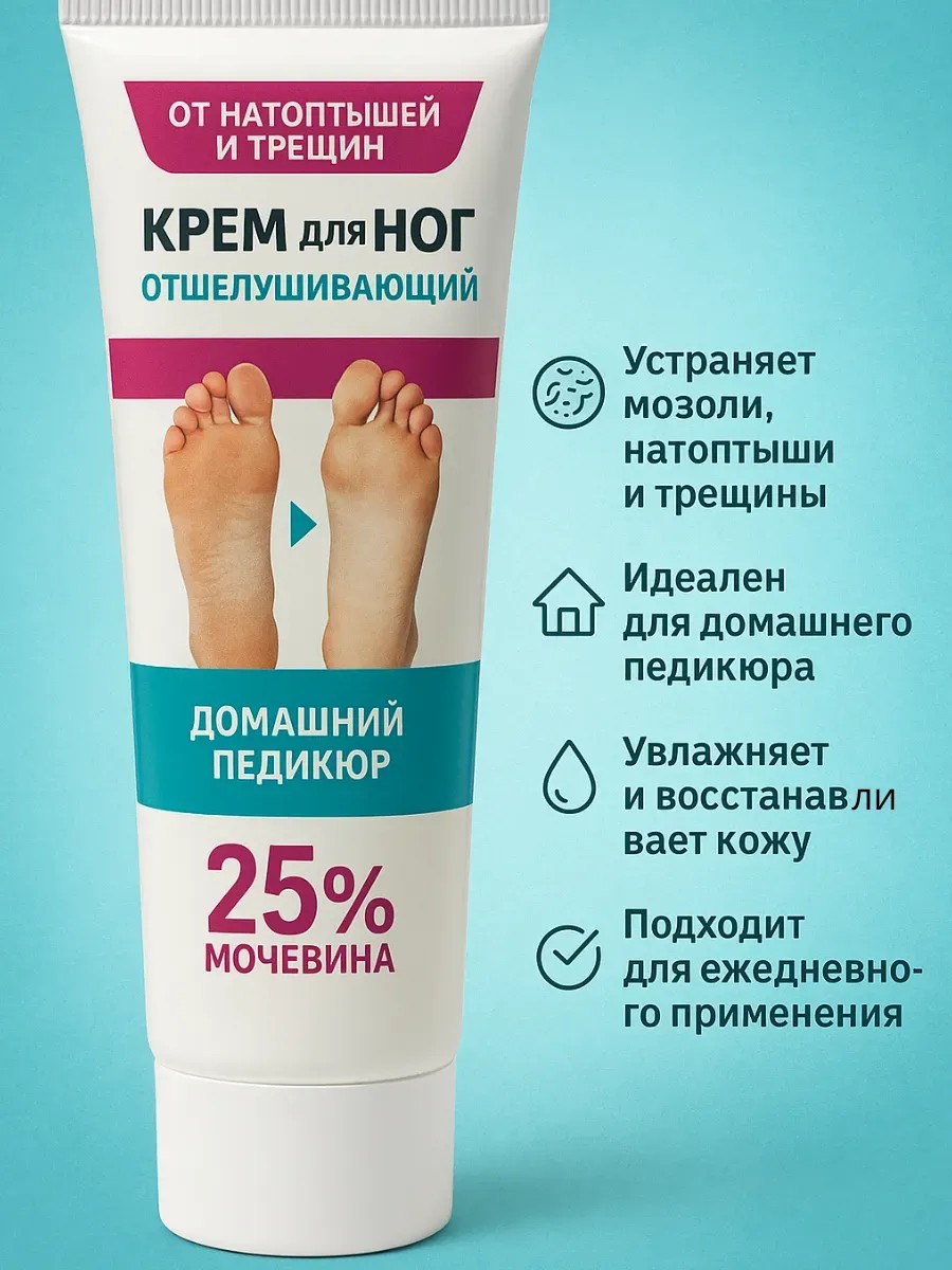 Эффективный отшелушивающий крем для ног с мочевиной 25% предназначен для интенсивного ухода за сухой, огрубевшей кожей стоп. Идеально подходит для удаления натоптышей, мозолей и трещин в домашних условиях.