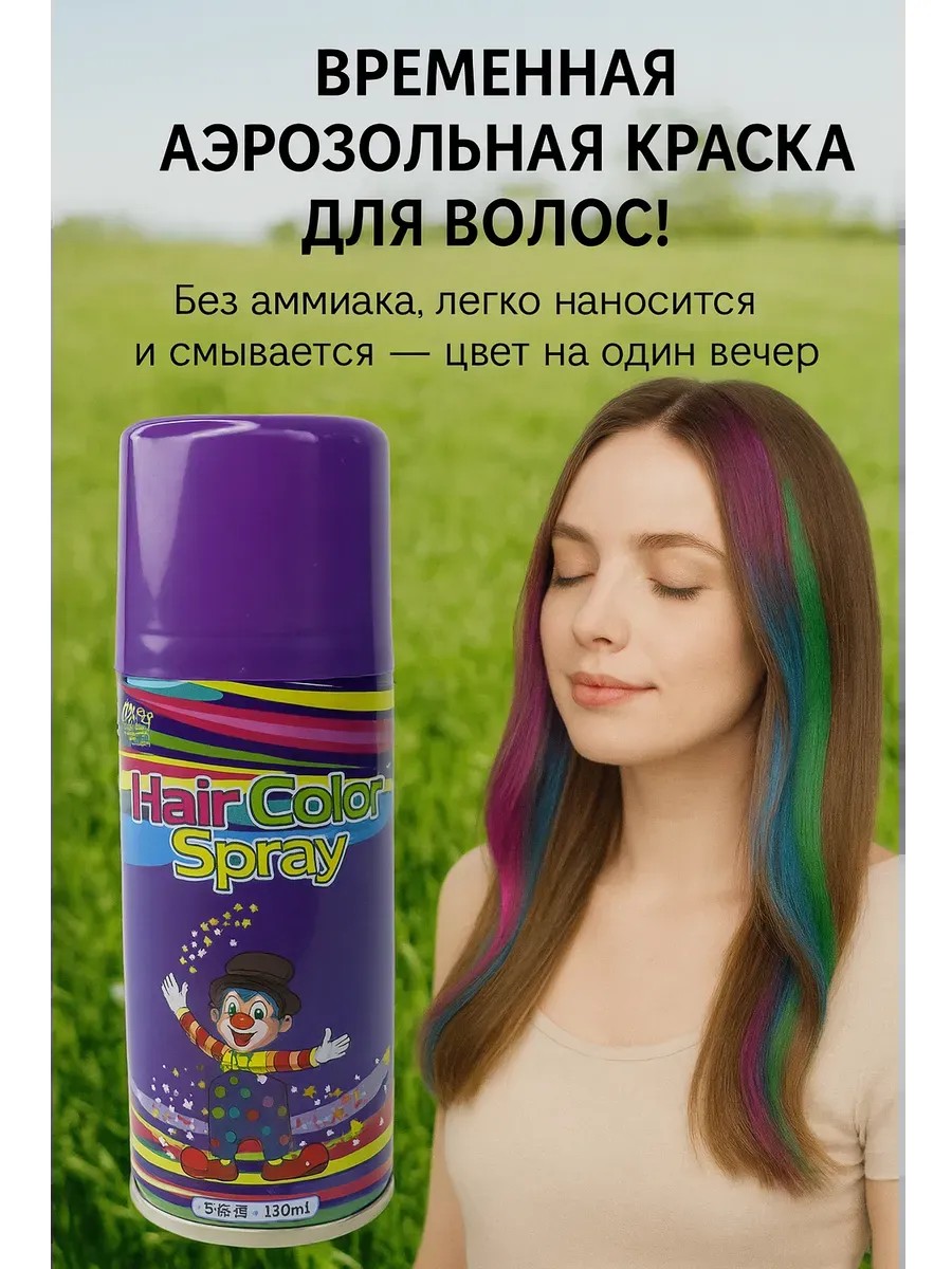 Аэрозольная краска для волос — идеальный выбор для временного окрашивания без вреда и усилий. Цветной спрей для волос подойдёт для вечеринки, фотосессии, Хэллоуина, праздника, косплея, театра или просто смены имиджа. Это временная краска для волос в баллончике с насыщенным пигментом, которая легко наносится и так же легко смывается шампунем. Подходит для детей и взрослых, равномерно ложится как на светлые, так и на тёмные волосы.