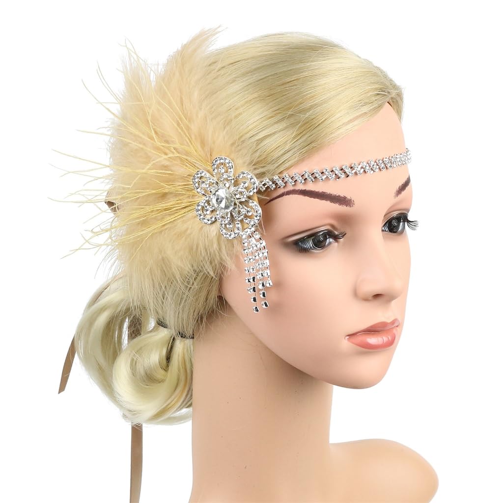 Features: Add touches of vintage style to your outfits with this stunning 1920s hairband headpiece. Made from quality feathers and decorated with , this headband is sure to turn heads. Perfect for women who like vintage fashion or are looking for a statement accessory for a special occasion. Whether you're attending a wedding, prom, or vintage dress party, this headband will complete your look. Besides, the adjustable ribbon rope ensures a comfortable fit for all head sizes. Specifications: Feather Suggested Head Circumference: 56-60cm 22.04-23.62in Color: Khaki Note: 1: Please allow 1-2cm errors due to manual measurement, make sure that you do not mind before you order. 2: Due to the difference between different monitors, the picture may not reflect the actual color of the item. Package Includes: 1pc Bohemia Style Feather HeadbandBesides, the adjustable ribbon rope ensures a comfortable fit for all head sizes. Whether you're attending a wedding, prom, or vintage dress party, this headband will complete your look. Perfect for women who like vintage fashion or are looking for a statement accessory for a special occasion. Made from quality feathers and decorated with rhinestone, this headband is sure to turn heads. Add touches of vintage style to your outfits with this stunning 1920s hairband headpiece.