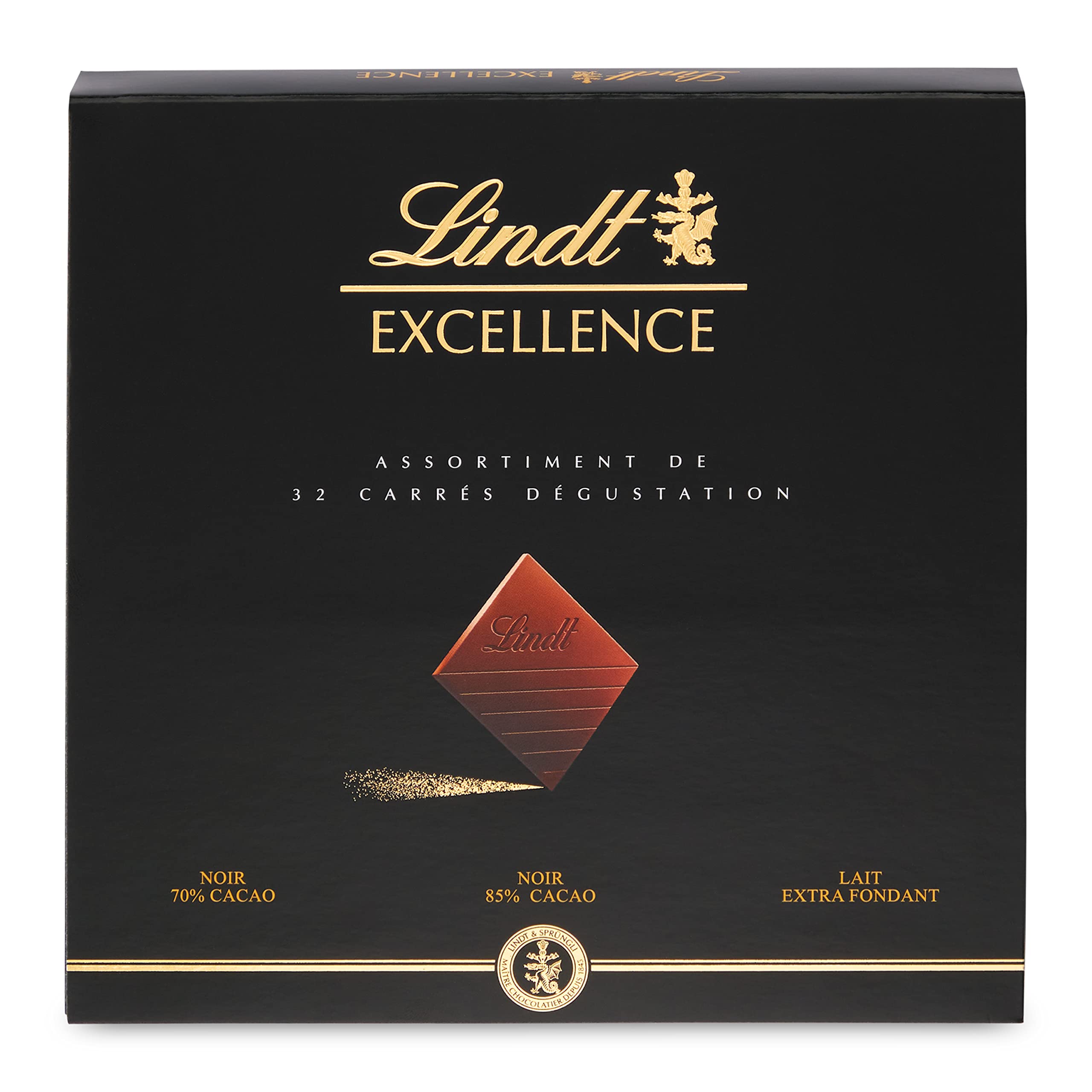 Discover the ultimate pleasure of Lindt Excellence chocolate to share or give as a gift. Find the best Lindt Excellence recipes: Dark 70 Cocoa, Dark 85 Cocoa and Extra Dark Milk in this assortment box of 32 tasting squares, ideal to accompany your coffee break. INGREDIENTS Ingredients: Cocoa mass, sugar, cocoa butter, fat-reduced cocoa, MILK powder, brown sugar, concentrated MILK BUTTER, LACTOSE, SKIMMED MILK powder, vanilla, BARLEY malt extract, emulsifier (SOY lecithin), flavoring (vanilla). INSTRUCTIONS FOR USE Do not expose to sunlight. SAFETY WARNING Allergen ingredients: Milk, Barley, Soy, Nuts Lindt Sprüngli SAS, Consumer Service, BP 49, FR-64402 Oloron - Sainte-Marie Cedex. Lindt Excellence: The Ultimate Pleasure. So Fine. So Intense. Coffee break accompaniment format. 32 tasting squares: Dark 70 , 85 and Extra Smooth Milk. 176g box. Découvrez l'ultime plaisir du chocolat Lindt Excellence à partager ou à offrir. Retrouvez les meilleures recettes Lindt Excellence : Noir 70 Cacao, Noir 85 Cacao et Lait Extra Fondant dans ce coffret d'assortiment de 32 carrés dégustation, idéal pour accompagner votre pause-café. INGRÉDIENTS Ingrédients: Pate de cacao, sucre, beurre de cacao, cacao maigre, poudre de LAIT, cassonade, BEURRE LAITIER concentré, LACTOSE, poudre de LAIT ECREME, vanille, extrait de malt d'ORGE, emulsifiant (lécithine de SOJA), arôme (vanille). MODE D'EMPLOI Ne pas exposer au soleil. AVERTISSEMENT DE SÛRETÉ Ingrédients allergènes : Lait, Orge, Soja, Fruits à Coque Lindt Sprüngli SAS, Service Consommateurs, BP 49, FR-64402 Oloron - Sainte-Marie Cedex. Lindt Excellence : L'Ultime Plaisir. Si Fin. Si Intense. Format accompagnement pause-café. 32 carrés de dégustation : Noir 70 , 85 et Lait Extra Fondant. Coffret de 176 g.