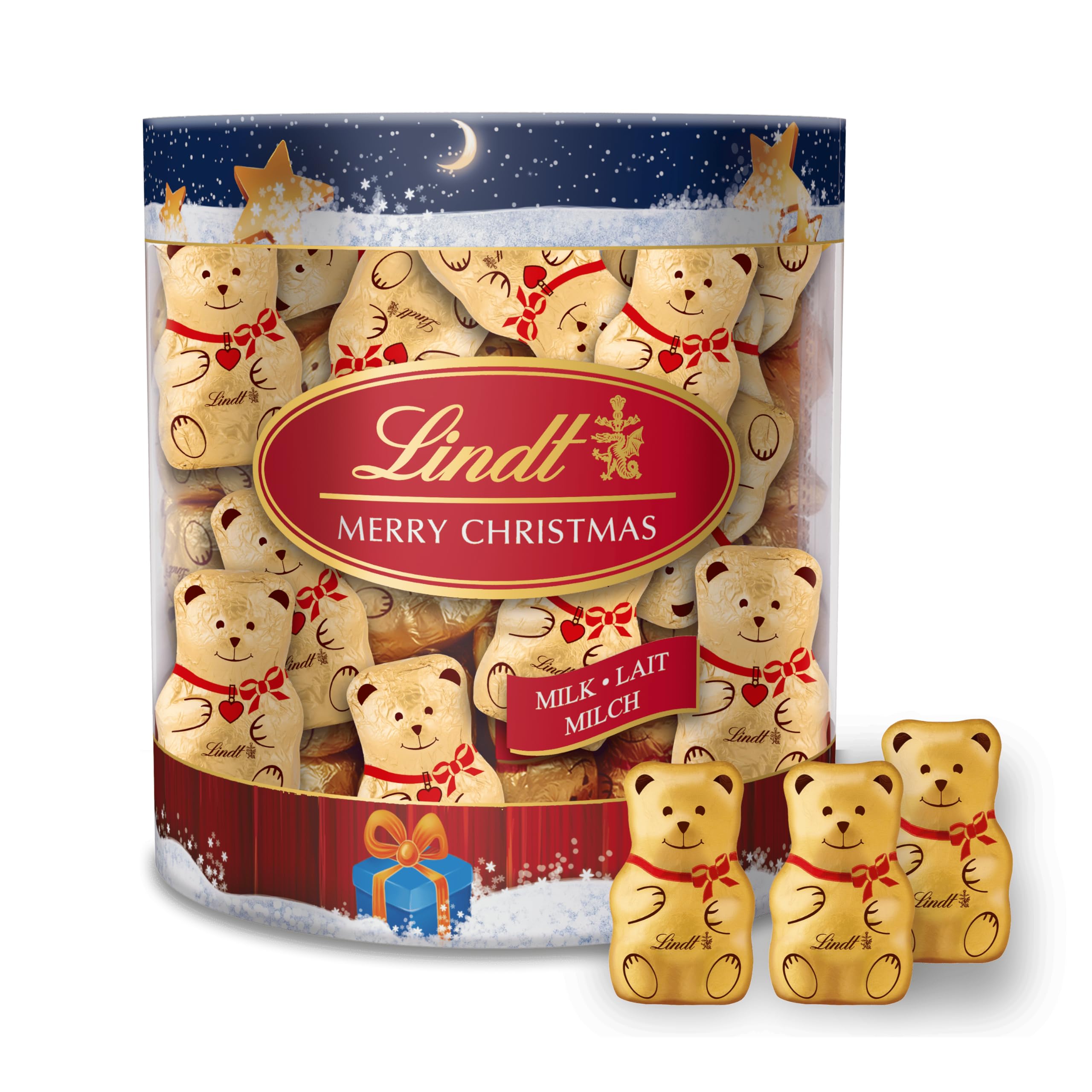 For the holidays, discover all of Lindt's expertise in the TEDDY Mini-Molded Box: a fun set of 70 crunchy Milk Chocolate TEDDY mini bears. The perfect gift to treat yourself or spoil your family and friends! INGREDIENTS MILK chocolate. Ingredients: sugar, cocoa butter, whole MILK powder, cocoa mass, LACTOSE, skimmed MILK powder, emulsifier (SOYA lecithin), BARLEY malt extract, concentrated MILK butter, flavoring. Cocoa: 30 minimum. INSTRUCTIONS FOR USE Give as a gift or enjoy during the holiday season. See more