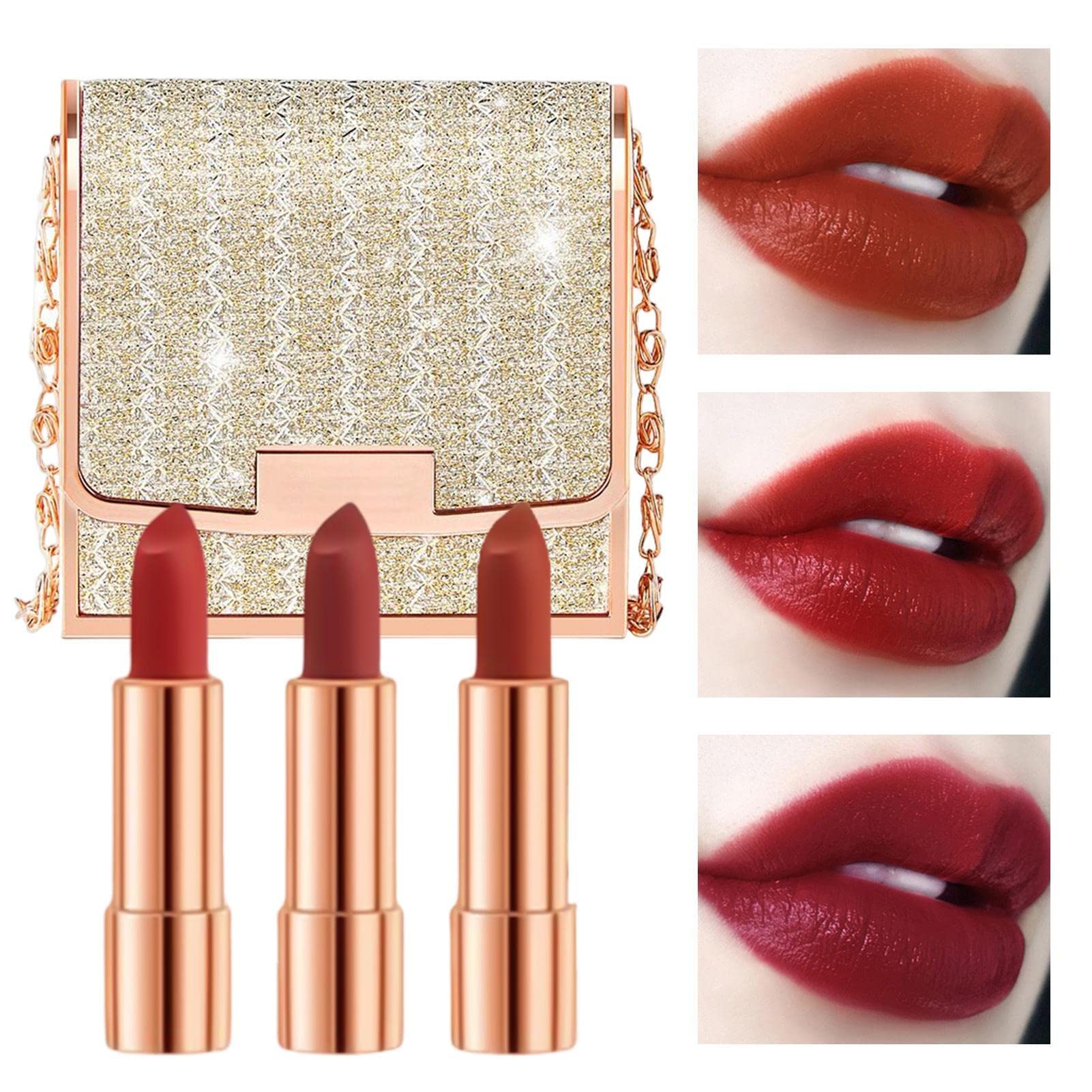 Description: This isn't just lipstick, it's art. Uniquely packaged with a chain bag, exquisite and easy to carry, this set contains three matte lipsticks. Illuminate your beautiful lips with our matte lipsticks in a charming chain bag. It's highly pigmented and delivers rich, intense color in a single swipe with a superb matte finish. With our unique gift packaging, you'll receive a pretty, easy-to-carry charm bag—the perfect gift for your loved ones for Valentine's Day, a birthday, or any special occasion. Features: Specifications: 3.5g x 3 pieces Package Contents: 1 set of matte lipsticksSuitable for various skin tones: This set of matte velvet lipsticks comes in 3 different shades. The color is so pretty and suits any makeup style or outfit. No matter your skin tone, you can choose the color that best complements your complexion. Easy to use: This set of nude lipsticks is made with non-irritating ingredients, is waterproof, sweat-resistant, long-lasting, non-sticky, and won't fade. The lightweight texture and natural color ensure a matte and velvety finish. Eye-catching gift: This set of 3 smooth, matte lipsticks will attract a lot of attention and make you the center of attention. It's an eye-catching gift. Quality formula: Contains vitamin E, is chemical-free, gentle, and non-irritating to the lips. Healthy, long-lasting, and charming, it helps you look more beautiful and charming. Non-sticky tip: No fading simply apply lightly to the lips, otherwise it will stick. After applying the matte velvet lipstick, it has a glossy matte velvet effect.3 rouges à lèvres en velours mat avec sac en chaîne - Kit maquillage pour lèvres - Crème durable - Taches à lèvres pigmentées - Imperméable LingjiongDESCRIPTION DU PRODUIT Descriptif : Ce n'est pas seulement du rouge à lèvres, c'est de l'art. Emballage cadeau unique avec un sac à chaîne, exquis et facile à transporter, le lot contient trois rouges à lèvres mats, illuminez vos belles lèvres avec nos rouges à lèvres mats dans un charmant sac à chaîne. Il est hautement pigmenté et offre une couleur riche et intense en un seul coup avec une superbe finition mate. Avec notre emballage cadeau unique, vous recevrez un joli sac à breloques facile à transporter, le cadeau parfait pour vos proches pour la Saint-Valentin, un anniversaire ou toute occasion spéciale. Caractéristiques : Spécifications : 3,5 g x 3 pièces. Liste : 1 set de rouge à lèvres matConvient pour différentes couleurs de peau : ce lot de rouges à lèvres en velours mat est disponible en 3 teintes différentes. La couleur est si jolie et s'adapte à tout style de maquillage ou tenue. Quel que soit le ton de la peau, vous pouvez choisir la couleur en fonction de votre teint. Facile à utiliser : ce lot de rouges à lèvres nude est composé d'ingrédients non irritants, imperméable, résistant à la transpiration, durable, antiadhésif et ne se décolore pas. La texture légère et la couleur naturelle assurent une finition mate et veloutée. Cadeau accrocheur : ce lot de 3 rouges à lèvres lisses et mats attirera beaucoup d'attention et vous fera le centre de la foule. C'est un cadeau accrocheur. Formule de qualité : contient de la vitamine E, sans produits chimiques, doux et non irritant pour les lèvres. Sain, durable et charmant, vous aide à être plus belle et charmante. Tasse antiadhésive : pas de décoloration, il suffit de siroter légèrement les lèvres, sinon elle collera. Après l'application du rouge à lèvres velours mat, il a un effet velours mat brillant.
