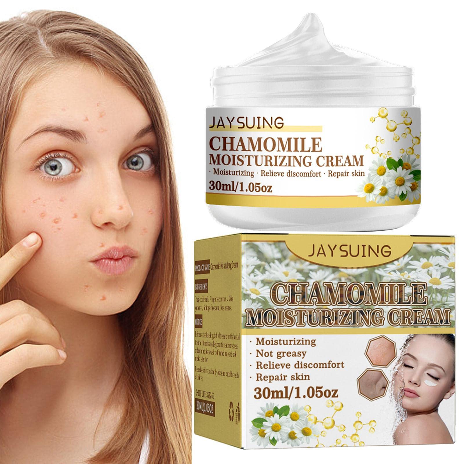 Description: 1. A variety of natural plant-based ingredients can moisturize dry skin, leaving it smooth, refreshing, non-sticky, and easily absorbed. 2. Revitalizes the skin and helps promote faster regeneration of damaged skin, restoring smooth and suppleness. 3. Improves the skin's oil-water balance, reduces oil, and alleviates stress on the skin. Features: Net Capacity: 30 ml Efficacy: Moisturizing, relieves dry skin, repairs skin Product List: 1 x Chamomile Moisturizing Cream Notes: Due to lighting effects and shooting angle, there may be a slight color difference in the product. Thank you. Due to manual measurement, there may be a slight tolerance in the product size.Skincare for every moment: Perform skincare for every moment. Deep Hydration Face Cream can effectively retain moisture and oil on the skin's surface. Even skin tone: Chamomile moisturizing face cream can help improve skin condition and give you a youthful glow, as it effectively relieves redness, improves dullness, and evens skin tone. Skin improvement: Use this hydrating face cream to optimally care for your skin with continued use. Your skin will be more radiant and healthier. Revitalize skin: This intensely moisturizing cream can effectively help rejuvenate the skin, improving its elasticity and restoring an even and radiant skin texture. Deep hydration: Chamomile moisturizing cream, with a variety of natural plant ingredients, not only provides moisture but also helps retain the skin's natural moisture and hydrate throughout the day.LINGJIONG 5 crèmes hydratantes pour le visage - Lotion pour le visage pour les femmes à peau sèche - Lotion hydratante pour le visage - Sans huile - Non grasseDESCRIPTION DU PRODUIT Descriptif : 1. Une variété d'ingrédients végétaux naturels peut hydrater la peau sèche, lisse, rafraîchissante, non collante et facile à absorber. 2. Revitalise la peau et aide à favoriser une régénération plus rapide des dommages et restaurer une peau lisse et souple. 3. Améliorez l'équilibre de l'eau et de l'huile, réduisez l'huile et réduisez le stress sur la peau. Caractéristiques : Capacité nette : 30 ml. Efficacité : hydratant, soulage la peau sèche, répare la peau. Liste des produits : 1 crème hydratante à la camomille. Remarques : En raison des effets de lumière et de l'angle de prise de vue, il y a une différence de couleur dans le produit, merci de En raison de la mesure manuelle, il y a une tolérance dans la taille du produit.Soin de la peau pour chaque instant : effectuez des soins de la peau pour chaque instant. La crème pour le visage Deep Hydration peut efficacement maintenir l'humidité et l'huile sur la surface de la peau. Teint uniforme de la peau : la crème hydratante à la camomille pour le visage peut aider à améliorer l'état de la peau et vous donner un éclat jeune, car elle soulage efficacement les rougeurs de la peau, améliore la matité et équilibre le teint. Amélioration de la peau : utilisez la crème hydratante hydratante pour le visage pour prendre soin de votre peau de manière optimale en cas d'utilisation continue. Votre peau sera plus radieuse et plus saine. Revitaliser la peau : la crème hydratante intense peut aider efficacement à rajeunir la peau, ce qui améliore l'élasticité de la peau et vous permet de restaurer une texture de peau uniforme et éclatante. Hydratation profonde : la crème hydratante à la camomille avec une variété d'ingrédients végétaux naturels apporte non seulement de l'humidité, mais aide également à maintenir l'hydratation produite par la peau et à hydrater tout au long de la journée.