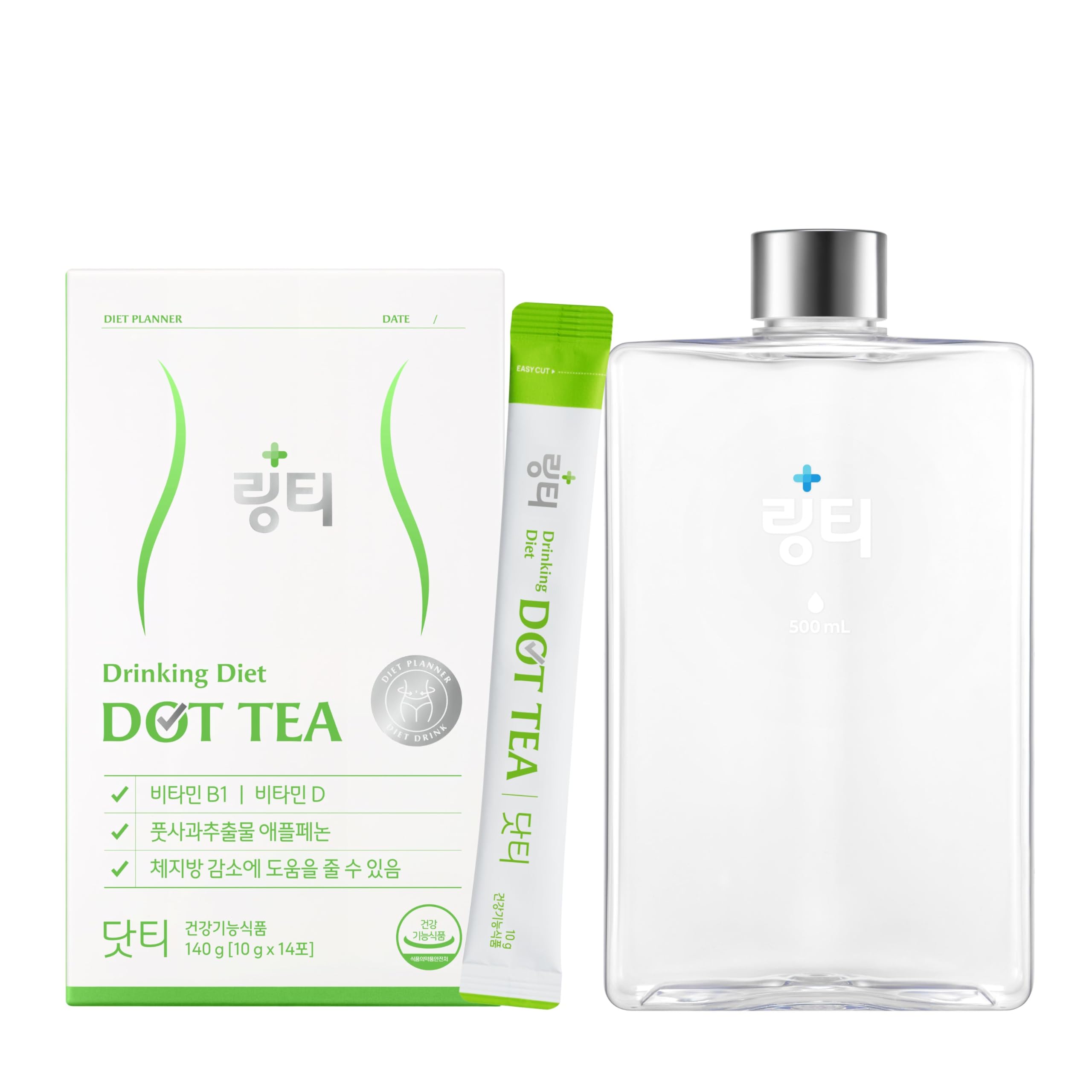 [Ecozen Plastic] - Ecozen plastic provide profile of heat-resistant plastic with eco-friendly material. [BPA Free] - Stay hydrated and healthy with BPA free reusable water bottle. [Nutrient Boost Antioxidant Power] – Loaded with apple phenolics to help fight oxidative stress, protect skin vitality, and support digestive wellness. [Refreshing Green Apple Flavor] – Enjoy a light and crisp green apple taste that's perfect for hot days or post-workout hydration—just mix one packet with 500mL cold water. [Doctor-Formulated Inner-Beauty Detox] – Developed by a Korean military doctor, Dot Tea combines apple-derived polyphenols with essential vitamins B1 D to support natural metabolism and healthy skin while aiding body-fat management.