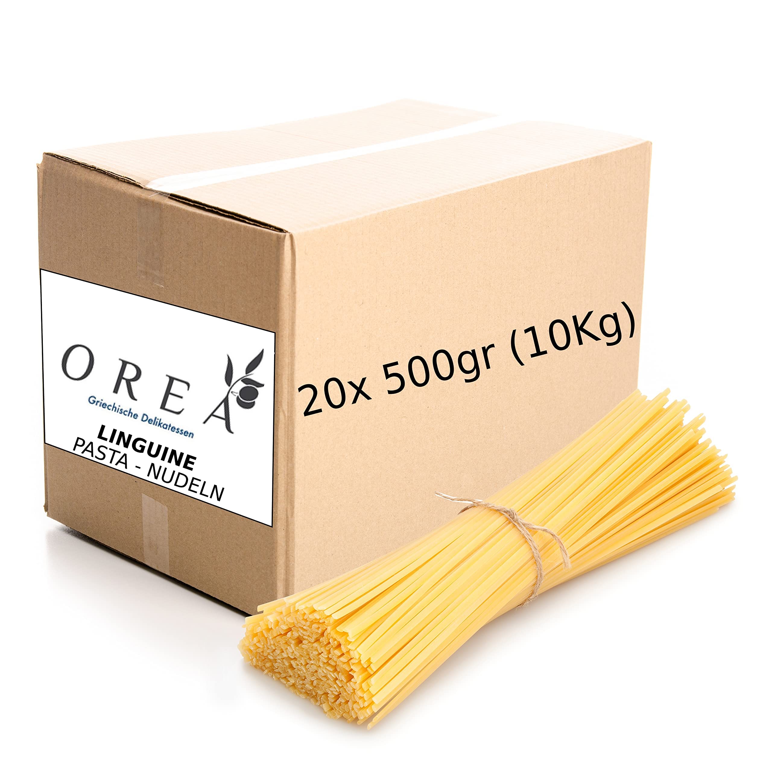 Linguine in the boxindividually packaged on: 20 x 500g.A total of 10kg pasta pasta - produced in Greece.Fits perfectly with all popular pasta dishes and for a very special taste experience - e.g. Bolognese, carbonara, pesto.etc. Experience Italian taste with linguine.100 high quality durum wheat and water.