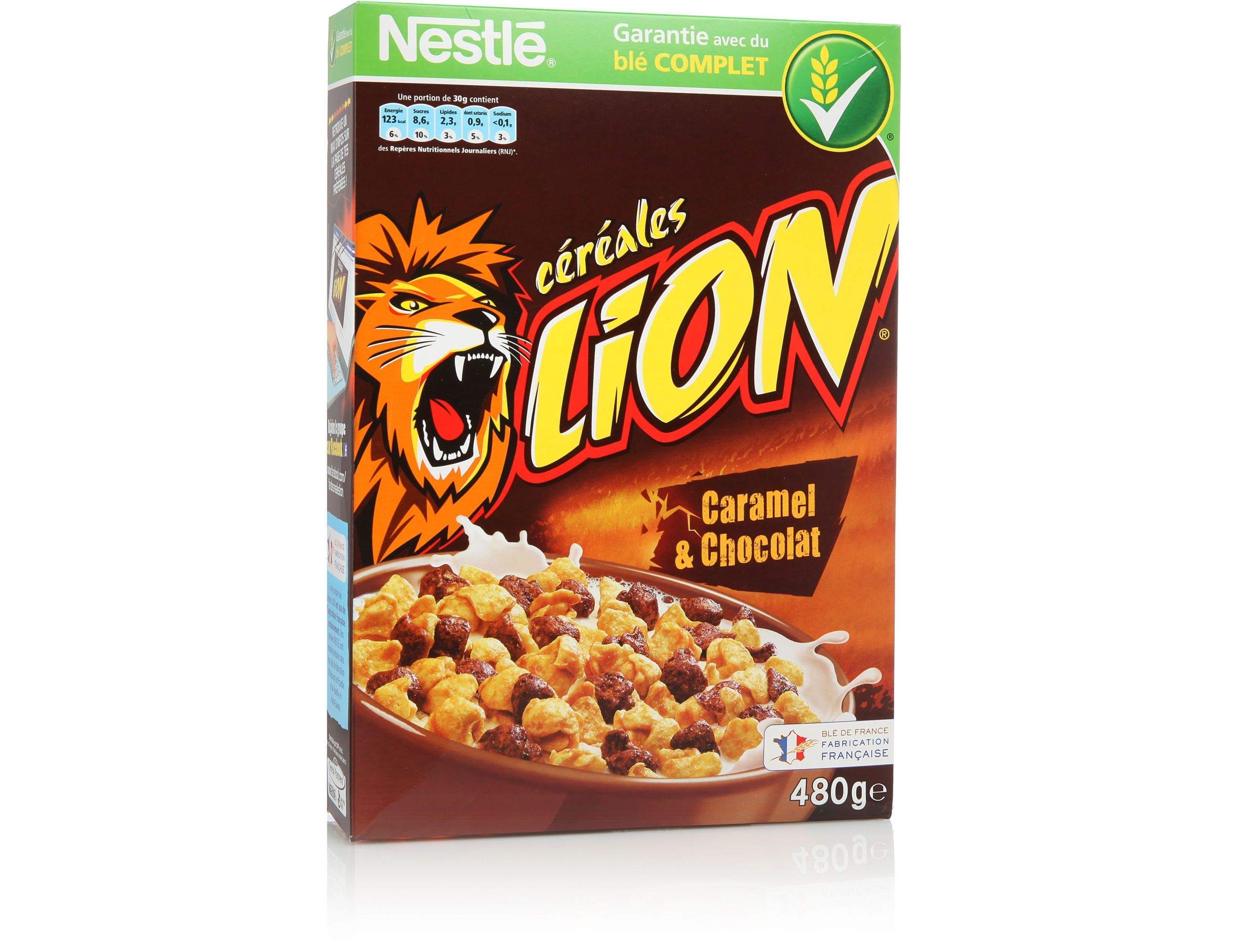 Lion cereals are the irresistible desire to have breakfast. With milk and fruit, a balanced breakfast to roar with pleasure! Guaranteed with whole wheat. Cereals enriched with: 8 vitamins, calcium, iron. Ready-to-eat cereals enriched with 7 vitamins, calcium, iron For your health, avoid eating too fatty, too sweet, too salty. Nestlé Products Company S.A. Nestlé France BP 900 Noisiel 77446 Marne la Vallée Cedex 2 INGREDIENTS Ingredients: Cereals 60.5 (whole WHEAT (38.9 ), WHEAT flour, rice flour), sugar, glucose syrup, caramel 6.4 (sweetened concentrated skimmed MILK (skimmed MILK, sugar), sugar, glucose syrup, pastry BUTTER, gelling agent: pectin, preservative: potassium sorbate, salt, flavor), chocolate 4.1 (sugar, cocoa powder, cocoa paste, cocoa lean powder), palm oil, salt, flavorings, emulsifier: sunflower lecithin, coloring: caramel (E150c). Vitamins (PP, B5, B2, B6, B1, B9, D) and minerals (calcium carbonate, iron). May contain traces of peanuts and tree nuts. Allergens: WHEAT, MILK, BUTTER DIRECTIONS FOR USE Close the inner bag tightly after each use and store in a dry place. DISCLAIMER Non-contractual photography. The above indications are given for information purposes. They are not necessarily exhaustive and cannot replace the information appearing on the product packaging which alone is authentic, and to which you are invited to refer, particularly in the event of food intolerance. The 480g box. Les céréales Lion c'est l'envie irrésistible de prendre un petit déjeuner. Avec du lait et un fruit, un petit déjeuner équilibré pour rugir de plaisir !Garantie avec du blé complet. Céréales enrichies en : 8 vitamines, calcium, fer. Céréales prêtes à consommer enrichies en 7 vitamines, calcium, fer Pour votre santé, évitez de manger trop gras, trop sucré, trop salé. Société des produits Nestlé S.A. Nestlé France BP 900 Noisiel 77446 Marne la vallée cedex 2 INGRÉDIENTS Ingrédients : Céréales 60,5 (BLE complet (38,9 ), farine de BLE, farine de riz), sucre, sirop de glucose, caramel 6,4 (LAIT écrémé concentré sucré (LAIT écrémé, sucre), sucre, sirop de glucose, BEURRE pâtissier, gélifiant : pectine, conservateur : sorbate de potassium, sel, arôme), chocolat 4,1 (sucre, cacao en poudre, pâte de cacao, cacao maigre en poudre), huile de palme, sel, arômes, émulsifiant : lécithine de tournesol, colorant : caramel (E150c). Vitamines (PP, B5, B2, B6, B1, B9, D) et minéraux (carbonate de calcium, fer). Peut contenir des traces d arachides et de fruits à coque. Allergènes : BLE, LAIT, BEURRE MODE D'EMPLOI Bien refermer le sachet intérieur après chaque utilisation et conserver dans un endroit sec. CLAUSE DE NON-GARANTIE Photographie non contractuelle. Les indications ci-dessus sont données à titre d'information. Elles ne sont pas forcément exhaustives et ne sauraient se substituer aux informations figurant sur l'emballage du produit qui font seules foi, et auxquelles vous êtes invités à vous reporter, notamment en cas d'intolérance alimentaire. La boîte de 480g.