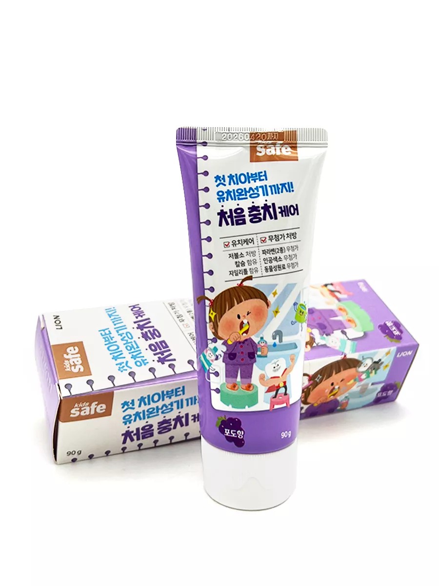 Детская зубная паста Lion Kids Safe со вкусом винограда (3-12 лет). Без красителей: не используются искусственные красители для придания красивого цвета зубной пасте. Продукт имеет прозрачную гелеобразную структуру. Без консервантов-парабенов: для сохранения натуральности в состав не были внедрены консерванты-парабены. Без сахарина: вместо него были использованы натуральные фруктовые добавки. Низкое содержание фторида: уменьшено до 500ppm, так как дети могут проглотить зубную пасту. Предотвращает появление кариеса и укрепляет зубную эмаль.