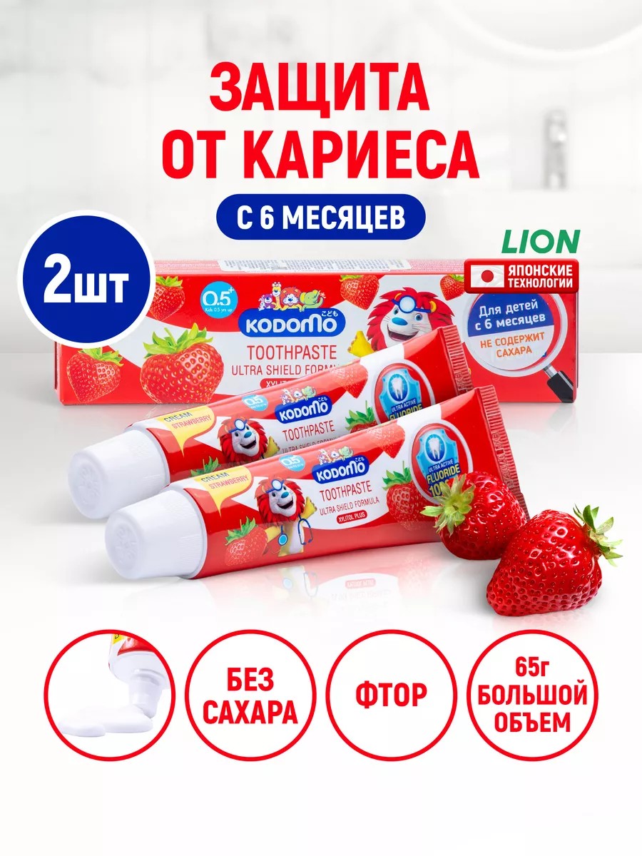 Kodomo Детская зубная паста/от кариеса и налета/без сахара/для детей с 6 месяцев/клубника, 65г -2 шт.