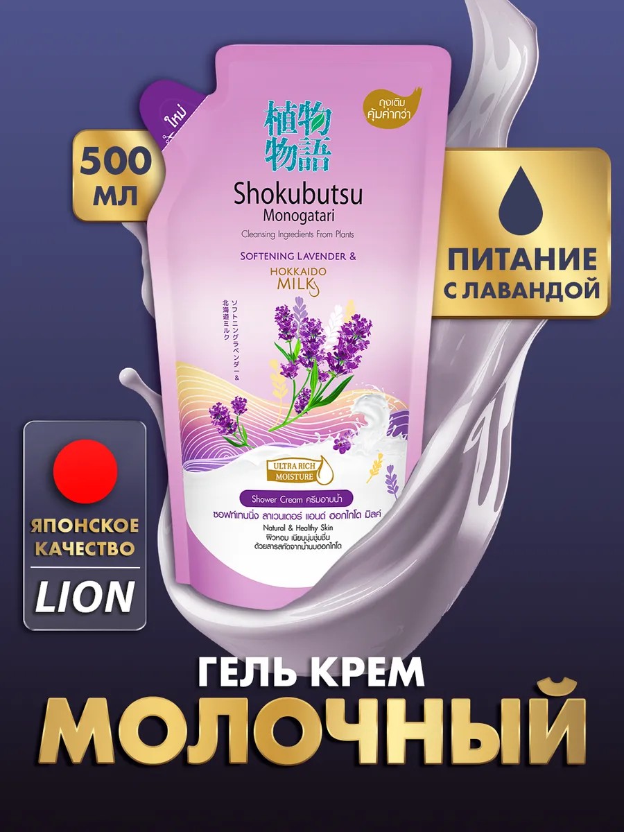Представляем Вам увлажняющий парфюмированный женский эко гель для душа и ванны в мягкой упаковке 500 мл. Shokubutsu Monogatari Лаванда и Молочко Хоккайдо.