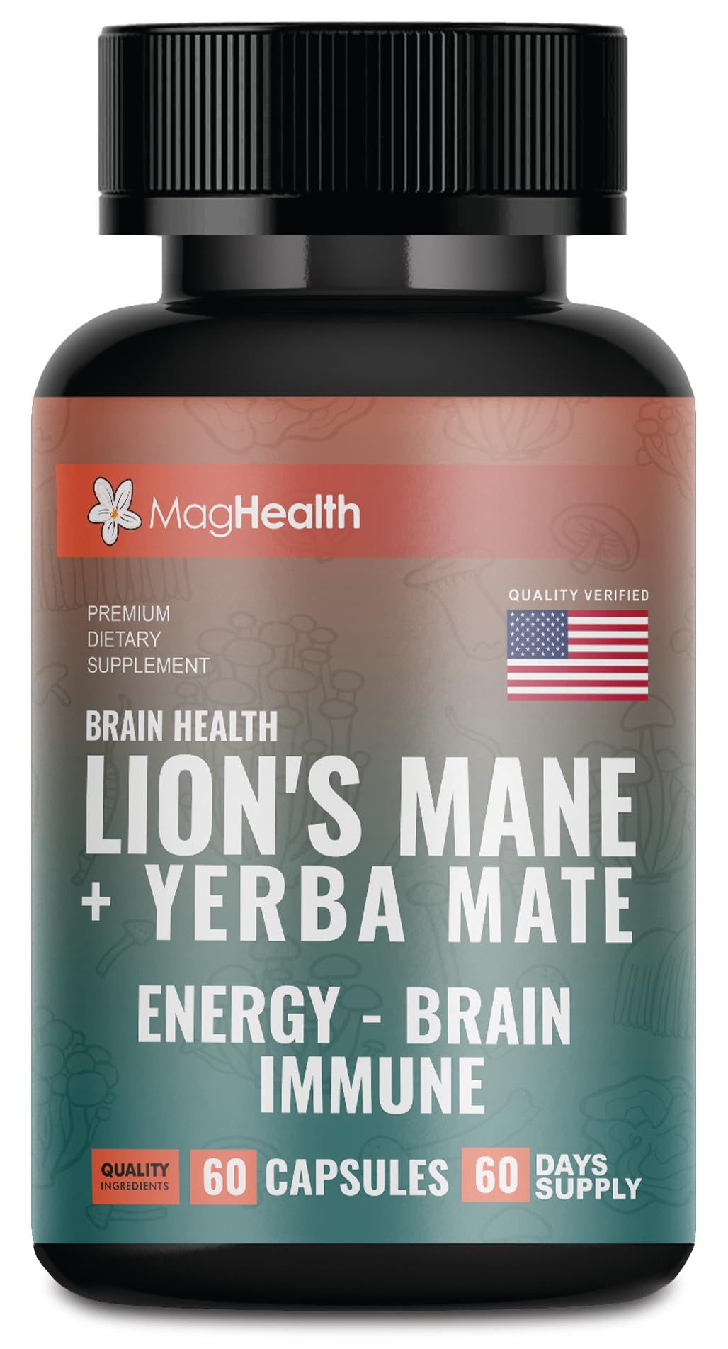 Lion's Mane & Yerba Mate Capsules 4-in-1 Nootropic Supplement | Organic Lion s Mane Mushroom for Focus, Clean Energy (75mg Caffeine) + Ashwagandha & Black Pepper | 60 Day Supply