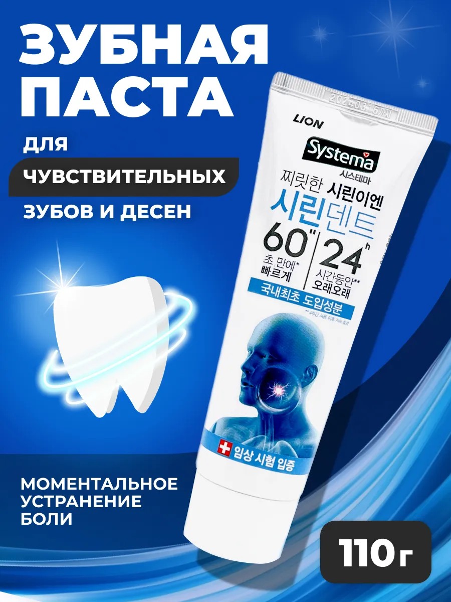 LION Зубная паста для профилактики повышенной чувствительности Systema Sirindent - с помощью специализированного биоактивного комплекса оно воздействует на нервные окончания, за 60 секунд устраняет болезненность, снижает чувствительность и кровоточивость десен, избавляет от дискомфорта при потреблении холодной, кислой, горячей пищи или напитков. Паста надолго сохраняет чистоту зубов и десен, поддерживает свежесть полости рта. Системная забота позволяет закрепить эффект обезболивания и снижения чувствительности. Для достижения лучшего эффекта рекомендуется нанести количество зубной пасты размером с горошину на палец и в течение 1 минуты массировать дёсны.