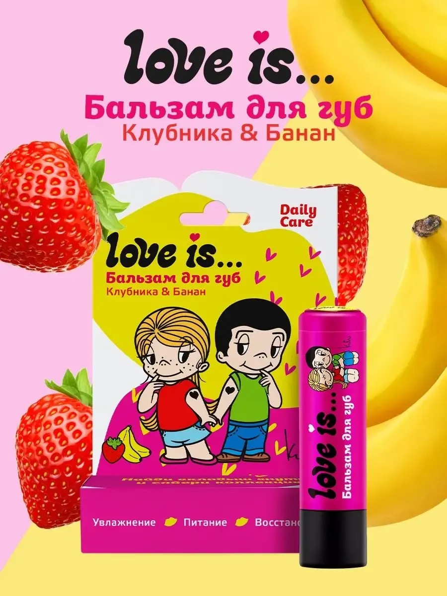 Линейка бальзамов для губ 'Love is...' в красивой и яркой упаковке разработана специально для коллекционеров-ценителей легенды 80-90х годов жевательной резинки LOVE IS... с любимым вкладышем внутри 'любовь - это…'. Бальзам состоит из натуральных ингредиентов с супер-увлажняющими и питательными компонентами, обладает ярким вкусом клубники и банана. Бальзам для губ «Love is…» содержит масла ши, кокоса и миндаля, которые интенсивно питают увлажняют кожу губ. Витамин E предотвращает старение кожи и обладает защитными свойствами. В составе также содержатся экстракты ромашки и календулы, которые в сочетании с пантенолом бережно ухаживают за кожей губ и обладают противовоспалительным действием. Отличная гигиеническая помада на холодное время года и при обветривании. Бальзам для губ станет замечательным подарком на любой праздник (Новый Год, День Святого Валентина, 23 февраля, 8 марта, 1 сентября, день рождения). Отлично подойдет как взрослым, так и детям, ведь бальзам не имеет в своем составе вредных веществ, таких как парабены и силиконы, а также не тестируется на животных.