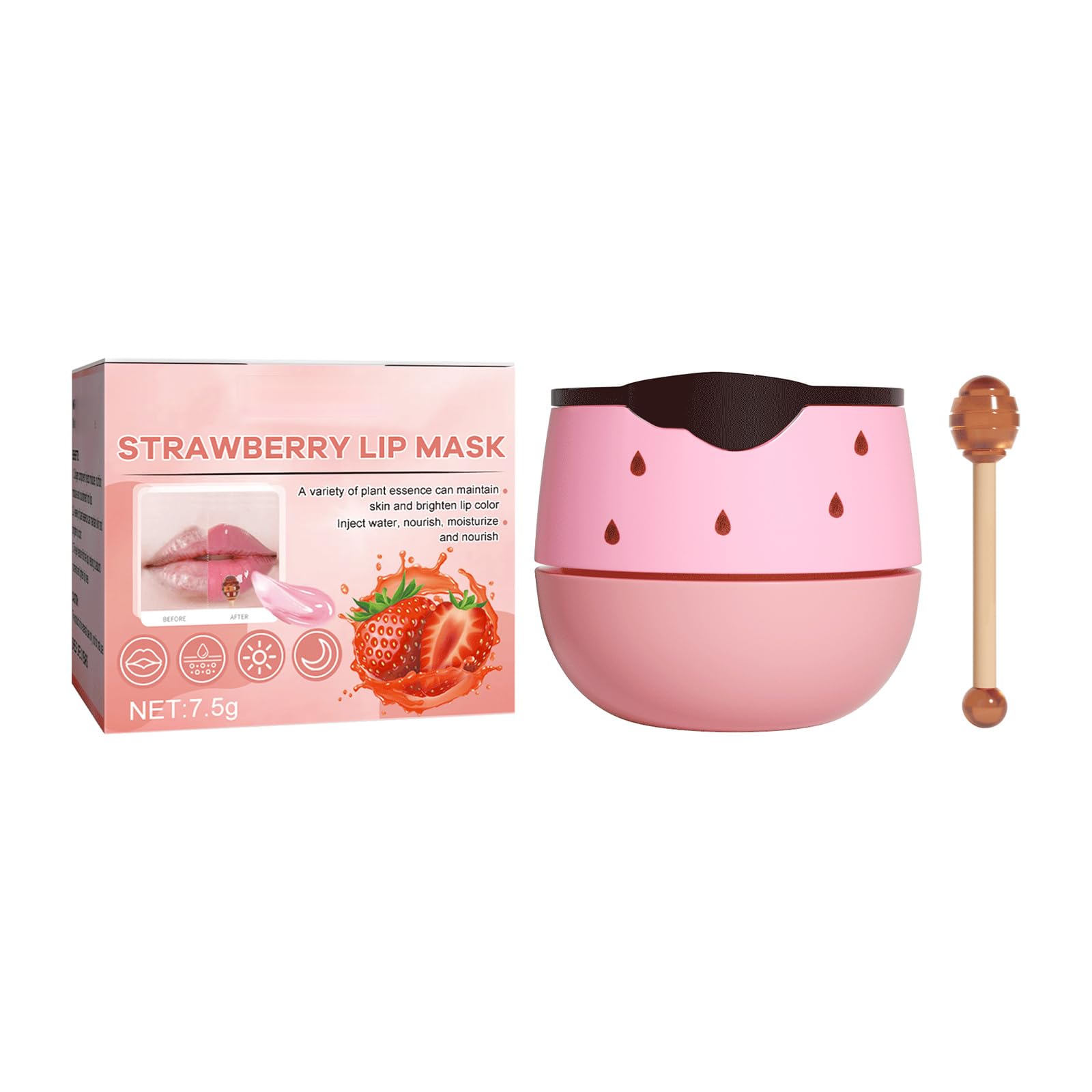 Net content: 7.5g Product name: Strawberry Lip Mask Keywords: Lip Color Repair, Moisturizing Gross weight: 35g Ingredients: Strawberry, Honey, Collagen Packaging size: 4.5 4.5 4.1cm Product size: 4.2 3.2 3cm Box size: 56 36 21.5cm