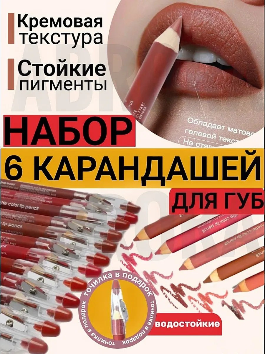 Набор карандашей для губ-это незаменимый помощник для создания идеального макияжа. В наборе представлены карандаши различных оттенков, которые идеально подойдут какдля повседневного, так и для вечернего образа. Мягкая текстура карандашей обеспечивает комфортное нанесение и равномерное покрытие, а стойкая формула гарантирует долгий срок службы макияжа. Карандаши легко растушевываются, позволяя создать как четкие контуры, так и мягкие, размытые линии. Карандаши для губ в наборе из б штук, каждый карандашдля губ -находка для любительниц макияжа. Макияж губ с карандашами нюдовых оттенков давно уже стал трендом. Для каждого карандаша есть своя точилка. Важно не забывать прокрашивать карандашами контур и линию губ перед нанесением помады. Набор карандашей для губ сегодня-Трендовый сет нюдовых тонов, подобранных профессионалами специально для тебя. Цветовая гамма подходит для любого типа внешности, тебе останется только выбрать четкий контур или растушевать.Матовые карандаши для губ имеют мягкий, но прочный грифель, который не ломается и не крошится при нанесении, интенсивно пигментированные цвета, легкую текстуру и стойкую формулу. Идеальный карандаш не смоется с губ от кофе, дождя или другого случайного контакта с водой ведь он водостойкий! Удобный колпачок-точилка позволит всегда содержать карандаш в боевой готовности. Используя карандаш для губ в повседневном макияже, вы сможете добиться более чёткого и аккуратного контура губ, а также зрительно сделаете их больше. Выберите свои оттенки из б ярких модных нюдовых насыщенных оттенков! Косметические карандаши. Отлично подойдет в качестве подарка на новый год,