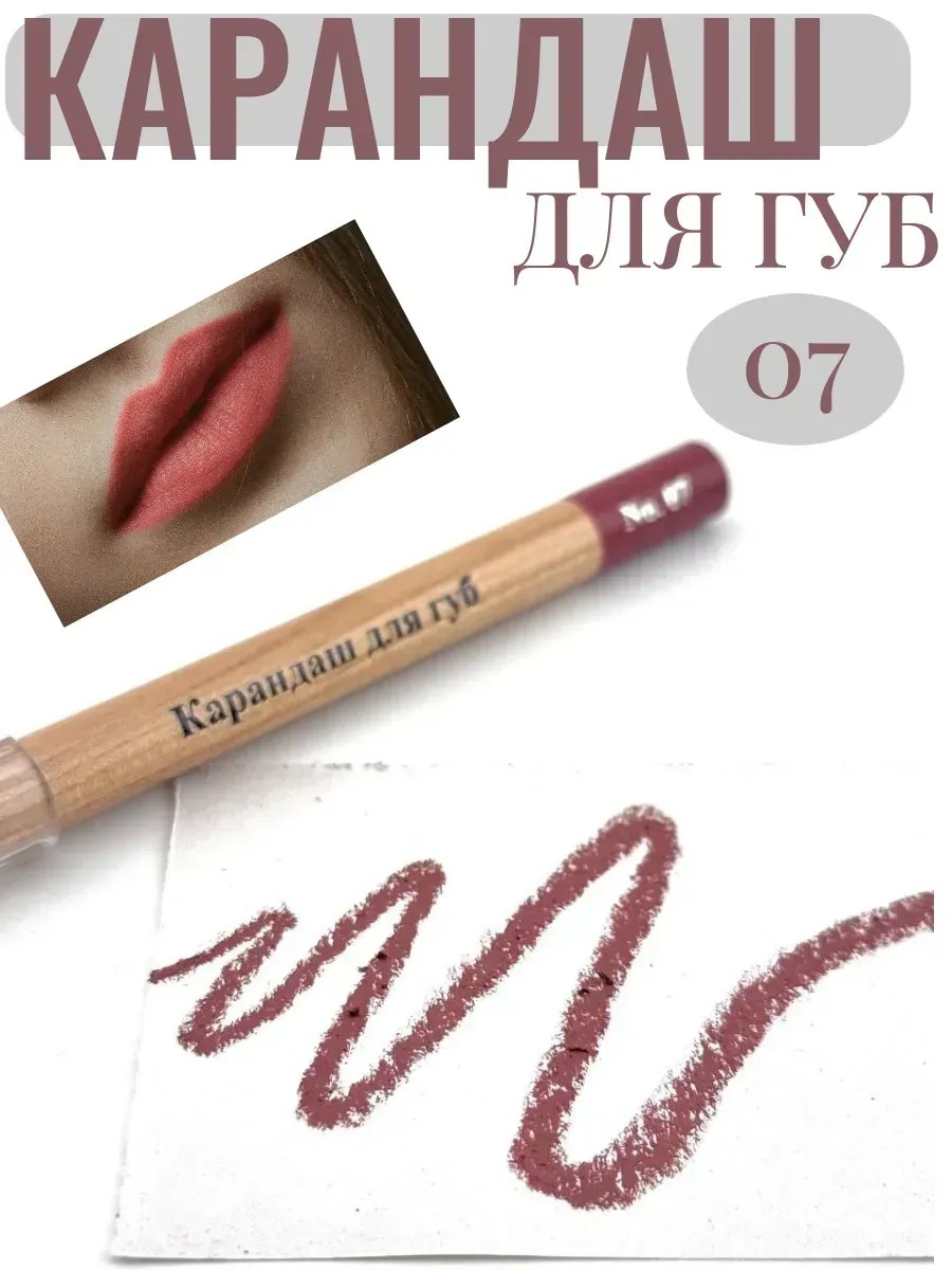 ----Классический карандаш для губ в удобном деревянном корпусе — незаменимый помощник для создания чёткого и выразительного контура губ. Оттенок №07 — универсальный нюд с розовато-коричневым подтоном, идеально подойдёт как для дневного, так и для вечернего макияжа. Мягкая текстура легко наносится, не растекается и обеспечивает стойкость в течение дня.