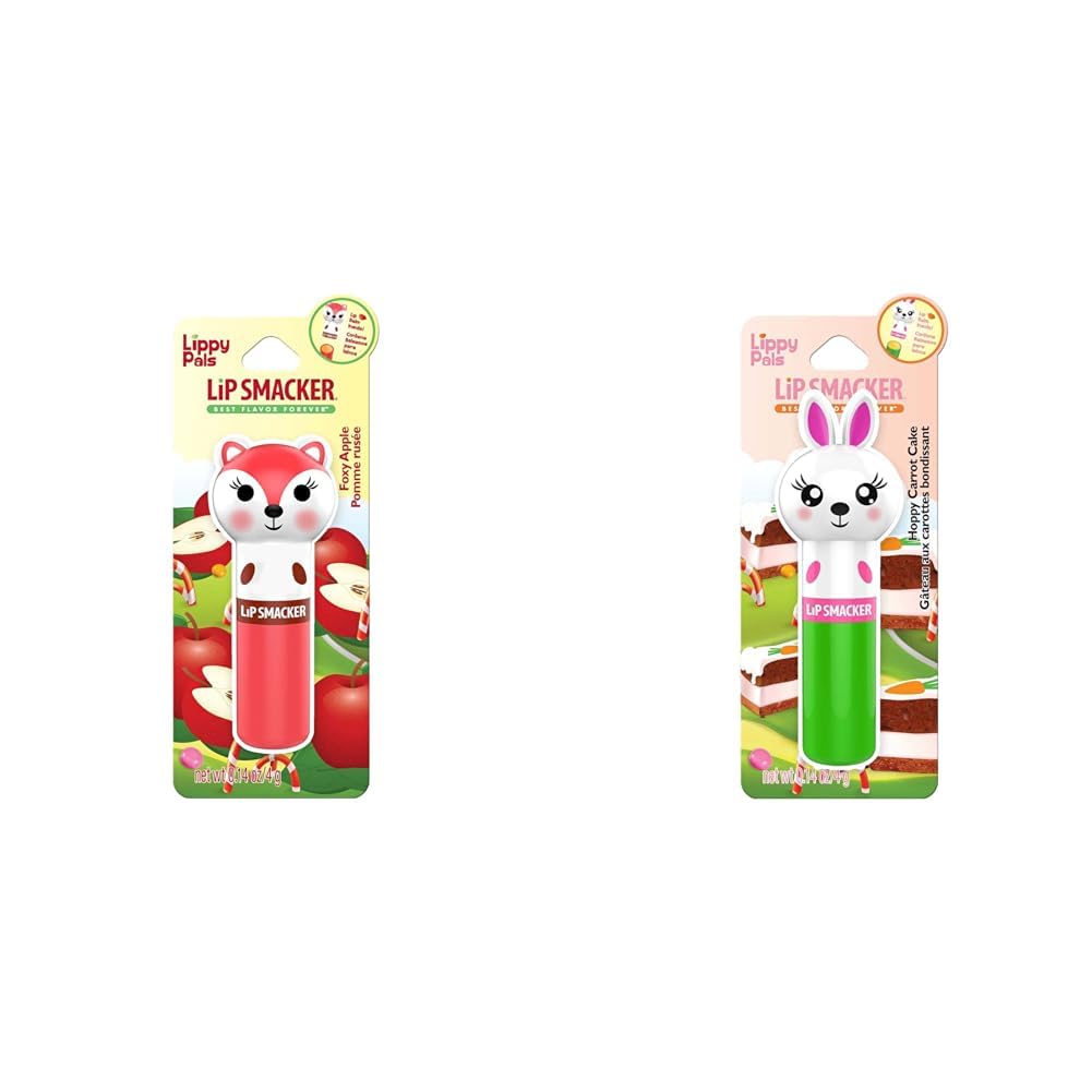 This fun and tasty lip balm bundle includes two moisturizing Lippy Pals from Lip Smacker - Foxy Apple and Hoppy Carrot Cake. The unique packaging features an adorable fox and bunny rabbit character on each lip balm to make you smile while keeping your lips smooth. Both moisturizing balms feature Lip Smacker's classic soft shine formula to hydrate lips while adding a subtle glossy finish. The Foxy Apple balm provides a sweet and tangy green apple flavor while the Hoppy Carrot Cake balm satisfies dessert cravings with a creamy carrot cake flavor. They help prevent dry, chapped lips with vitamins and fruit extracts. These Lippy Pals lip balms complement each other perfectly - use the fruity apple balm during the day for a sweet lip treat and switch to the richer cake flavor in the evenings. With different fun flavors, scents, and packaging, this bundle adds variety to your lip care routine. It also makes a great gift set for lip balm lovers. Keep your lips healthy and happy with this cute and nourishing lip duo from a trusted lip care brand since 1973. The moisturizing formula and playful packaging will put a smile on your lips!