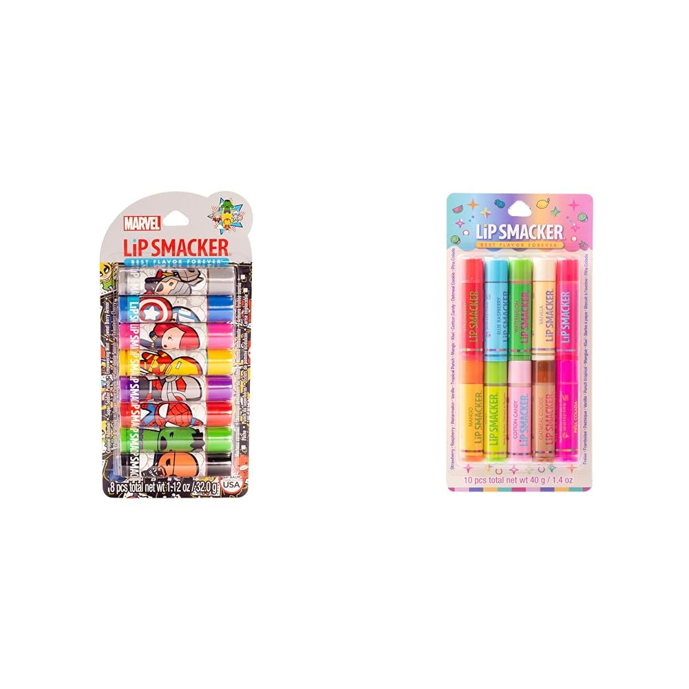 This fun lip balm bundle includes an 8-pack of Marvel Avengers-themed lip balms and a 10-pack of Lip Smacker's original, classic flavors. The Marvel pack features Spiderman, Iron Man, Captain America, and other Avengers characters in sweet flavors like strawberry and watermelon. Meanwhile, the classic pack includes Lip Smacker favorites like vanilla, cotton candy, and pina colada. Both packs provide long-lasting moisture and a glossy finish to combat dry, chapped lips. With their moisturizing ingredients, delicious scents, and fun, collectible packaging, these Lip Smacker products make great gifts. The Avengers pack is perfect for Marvel fans and kids, while the classics pack brings out your inner child. With 18 total lip balms spanning heroic and nostalgic themes, this bundle has something for everyone. Mix and match between packs to discover new flavor combinations and find your perfect lip-softening, smile-inducing Lip Smacker. As always, Lip Smacker products are cruelty-free and never tested on animals.All Lip Smacker lip balms are cruelty-free and never tested on animals. This 18-piece Marvel Avengers and classic flavor lip balm set makes a fun and colorful gift for birthdays, holidays, or any occasion. Every Lip Smacker lip balm is made with moisturizing nutrients that lips love - they go on smooth like butter and leave your lips soft, sweet, and wanting more. Get a taste of 10 of our original and most popular lip balm flavors, including Oatmeal Cookie, Vanilla, Mango, Watermelon, Tropical Punch, Cotton Candy, Kiwi, Strawberry, Blue Raspberry, and Pina Colada. Fight the crime of dry and chapped lips with the help of your favorite Marvel superheroes, including Thor, Captain America, Black Widow, Iron Man, Ant Man, Spider Man, The Hulk, and Nick Fury.