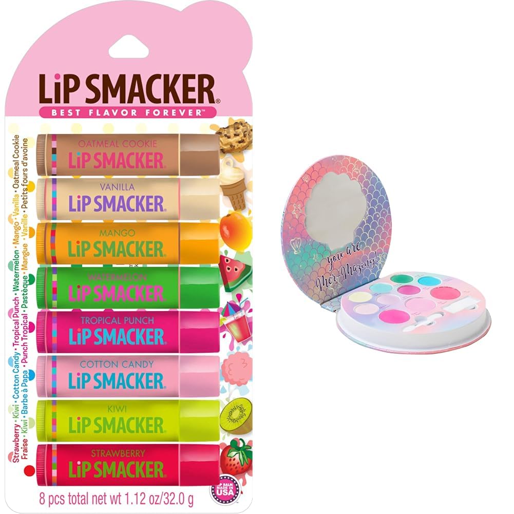 Lip Smacker Original Best Holiday Flavored Lip Balm Party Pack, Oatmeal Cookie, Vanilla, Mango, Watermelon, Tropical Punch, Cotton Candy, Kiwi, Strawberry, Clear Great-Tasting Treats. Party Fun. The best flavor forever lip gloss in a Lip Smacker Party Pack assortment that's perfect for collecting and sharing. Moisturize and soften lips with lip smacking' flavor and shine. Includes: Vanilla, Mango, Wild Raspberry, Watermelon, Tropical Punch, Cotton Candy, Kiwi, Strawberry. Give 'em, Collect 'em, Share 'em. Lip Smacker Sparkle Shine Eyeshadow Makeup Palette, Mermaid Palette Shimmer Christmas Make Up Collection Holiday Present Gift for Girls Sparkle wherever you go! Mix and match eyeshadows, highlighter and blush for the perfect shade of "you".Product 2: Soft, blendable formulas for eyes and face. Product 2: Sparkle wherever you go. Mix and match eyeshadows, highlighter and blush for the perfect shade of "you". Product 1: LIP SMACKIN': We've been your trusted choice for flavored lip balms lip glosses since we introduced the first flavored lip balm on the market. From cotton candy to Dr. Pepper, we've got your flavor. Product 1: HYDRATE PROTECT: Lip Smackers flavored lip balms come in a wide variety of flavors to delight your senses keep lips smooth, moisturized, protected. Makes a great party favor. Product 1: LIP BALM: Moisturize your lips with a huge variety of Lip Smacker lip balms. Choose your lip balm from delicious classic flavors like strawberry lip balm or cherry lip balm, or our more creative flavors like Dr. Pepper, Vanilla Coke, or Cotton Candy. Product 1: PARTY FUN: The best flavor forever lip gloss in a Lip Smacker party pack assortment that's perfect for collecting and sharing with flavor that lasts. Includes: Oatmeal Cookie, Vanilla, Mango, Watermelon, Tropical Punch, Cotton Candy, Kiwi, and Strawberry.