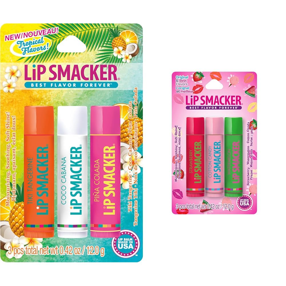 Tropical and classic lip balms are clear, lightweight and easy to apply. Original Lip Smacker flavors are dermatologist tested and fun for all ages. Flavored lip balms provide moisture and shine in a convenient 3-count set. Enjoy 0.14 oz of Strawberry, Watermelon and Cotton Candy classic Lip Smacker lip balms. Tropical lip balm trio includes Tiki Tangerine, Coco Cabana and Pina Colada flavors.