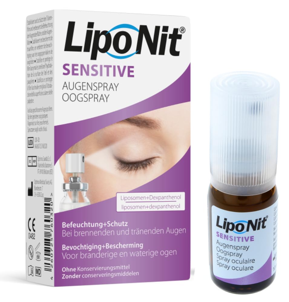 LipoNit Eye Spray Sensitive for improved lubrication of irritated eyes, 10 ml? Easy to use. Without preservative? Can be used with all contact lenses, LipoNit eye spray Sensitive, just like Lipo Nit eye spray, for improved hydration of the eyes and eyelids. LipoNit eye spray Sensitive also stabilizes the protective lipid layer of the tear film, but it is without preservatives and also contains dexpanthenol for additional care and hydration of the eyes as well as preventive protection of the skin. It should be used for sensitivity disorders of the eyes such as dry and watery eyes, burning, itching and foreign body sensation. More practical than drops? Comfortable to use, just spray on the closed eye? Without preservatives? Clinically tested? Does contact lenses increase wearing comfort? Can be used for 6 months after the first use. Lipo Nit and Lipo Nit Sensitive work against dry eyes, burning, scratches and sand grain feeling, because they restore the defective tear film through liposomes. Germans suffer from dry eyes, the most common eye disease today. The multi-layer tear film is severely disturbed, causing dry spots to form on the eye. The result are the typical complaints of dry eye? Burning, scratching, grain of sand feeling. The reasons are manifold? computer work, menopause, air conditioning, contact lenses, environmental pollution, etc. In approximately 80 of all patients, dry eye is caused by a disruption of the lipid layer. This is the outer layer of the tear film, which should actually protect the underlying aqueous layer. If the lipid layer is disrupted, the tear layer evaporates more quickly or tears flow over the eyelid margin. An intact lipid layer reduces evaporation by up to 95 .Can be used with all contact lenses. Without preservatives. Easy to use. For better moisturizing of watery, dry, irritated eyes and for eye care.LipoNit Oogspray Sensitive voor verbeterde bevochtiging van geïrriteerde ogen, 10 ml 10ml LipoNit Oogspray Sensitive voor verbeterde bevochtiging van geïrriteerde ogen, 10 ml? Eenvoudig in gebruik. Zonder conserveringsmiddel? Met alle contactlenzen te gebruiken LipoNit oogspray Sensitive dient net als Lipo Nit oogspray voor een verbeterde hydratatie van de ogen en oogleden. LipoNit oogspray Sensitive stabiliseert ook de beschermende lipidelaag van de traanfilm is echter zonder conserveringsmiddel en bevat bovendien dexpanthenol ter aanvullende verzorging en hydratatie van de ogen als preventieve bescherming van de huid. Het moet worden gebruikt bij gevoeligheidsstoornissen van de ogen zoals droge en tranende ogen, branden, jeuk en vreemd lichaamsgevoel. Praktischer dan druppels? Comfortabel in gebruik, gewoon op het gesloten oog spuiten? Zonder conserveringsmiddelen? Klinisch getest? Verhoogt het draagcomfort van contactlenzen? Na het eerste gebruik 6 maanden te gebruiken Lipo Nit en Lipo Nit Sensitive werken tegen droge ogen, branden, krassen en zandkorrelgevoel, omdat het de defecte traanfilm door liposomen herstelt. Duitsers lijden aan droge ogen, de meest voorkomende oogziekte van vandaag. Daarbij is de meerlaagse traanfilm sterk verstoord, zodat droge plekken op het oog ontstaan. Het gevolg zijn de typische klachten van het droge oog? Branden, krassen, zandkorrelgevoel. De redenen zijn veelzijdig? beeldschermwerk, overgang, airconditioning, contactlenzen, milieubelastingen enz. Bij ongeveer 80 van alle patiënten wordt het droge oog veroorzaakt door een verstoring van de lipidelaag. Dit is de buitenste laag van de traanfilm, die de onderliggende waterige laag eigenlijk moet beschermen. Als de lipidelaag wordt verstoord, verdampt de traanlaag sneller of stroomt het dan tranen over de ooglidrand af. Een intacte lipidelaag vermindert de verdamping met maximaal 95 .Met alle contactlenzen te gebruiken. Zonder conserveringsmiddelen. Eenvoudig in gebruik. Voor een betere bevochtiging van tranende, droge, geïrriteerde ogen en voor de verzorging van de ogen.