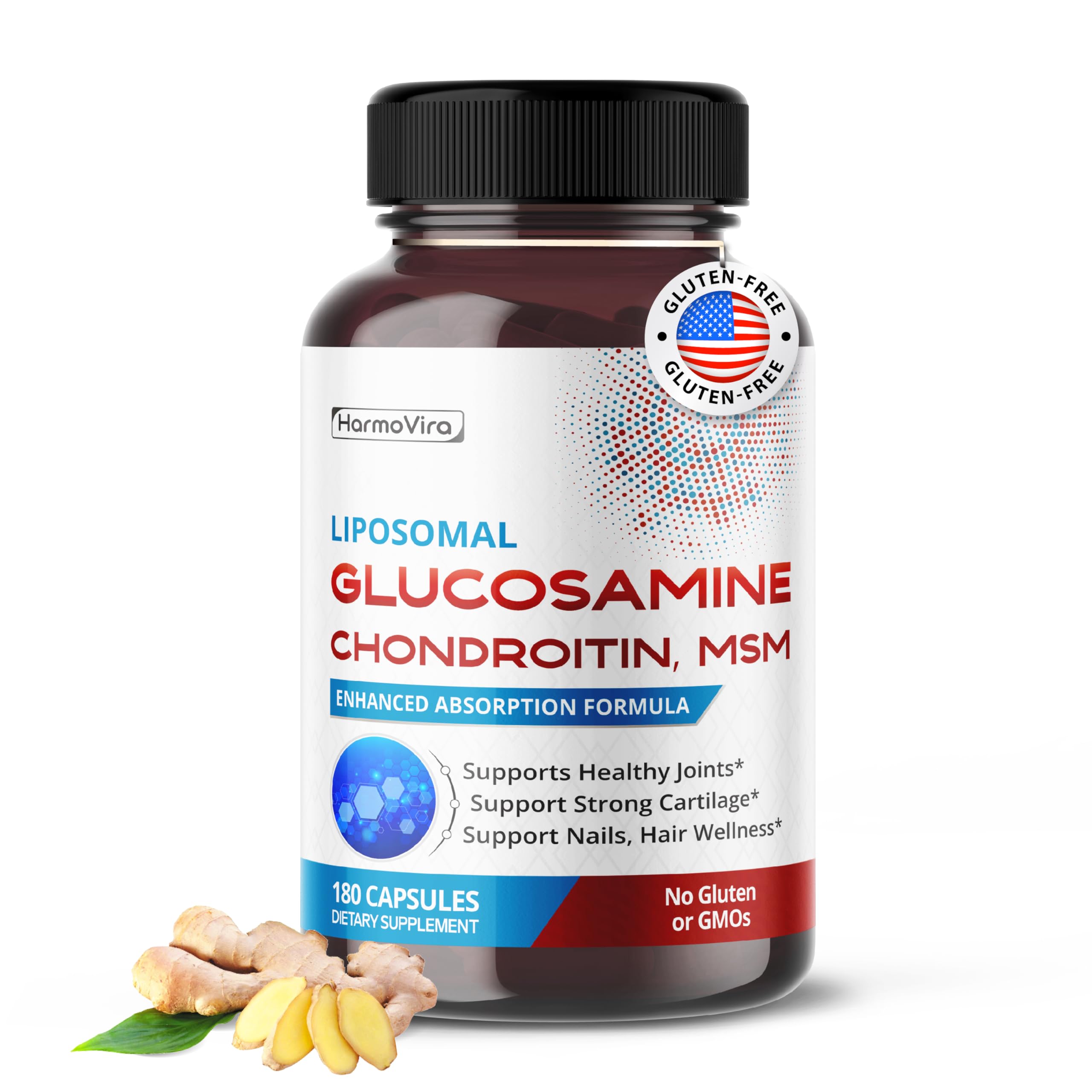 Support your joint flexibility, cartilage health, and outer vitality with HarmoVira's advanced Liposomal Glucosamine Chondroitin MSM formula. This high-absorption supplement blends 12 powerhouse ingredients including Glucosamine HCl, MSM, Chondroitin Sulfate, Collagen Complex (Types I–IV), Hyaluronic Acid, Omega-3, Vitamin D3 K2, and Black Pepper for enhanced bioavailability. Formulated for those seeking joint comfort and mobility, this daily capsule also supports strong hair, nails, and skin health with essential building blocks like hydrolyzed collagen peptides and hyaluronic acid. Delivered in a liposomal format to support better absorption, each serving is designed to help your body get the most from every dose. With 180 long day supply per bottle and no gluten, GMOs, or fillers, HarmoVira provides a convenient way to support joint and beauty wellness—inside and out.Plant-Based Omega 3 Black Pepper: Contains flaxseed-derived Omega-3 and Black Pepper extract to support daily wellness and absorption. . With Vitamin D3 K2: Provides essential nutrients that work synergistically to support bone and joint function. . Collagen Complex for Connective Tissue Health: Features a multi-source collagen blend (Types I, II, III, IV) to support strong cartilage, skin elasticity, and overall joint structure. . Comprehensive Joint Support Blend: Includes Glucosamine, Chondroitin, MSM, and Hyaluronic Acid to help support joint flexibility, comfort, and mobility. . Advanced Liposomal Delivery: Formulated with liposomal technology to enhance absorption and support optimal effectiveness. .