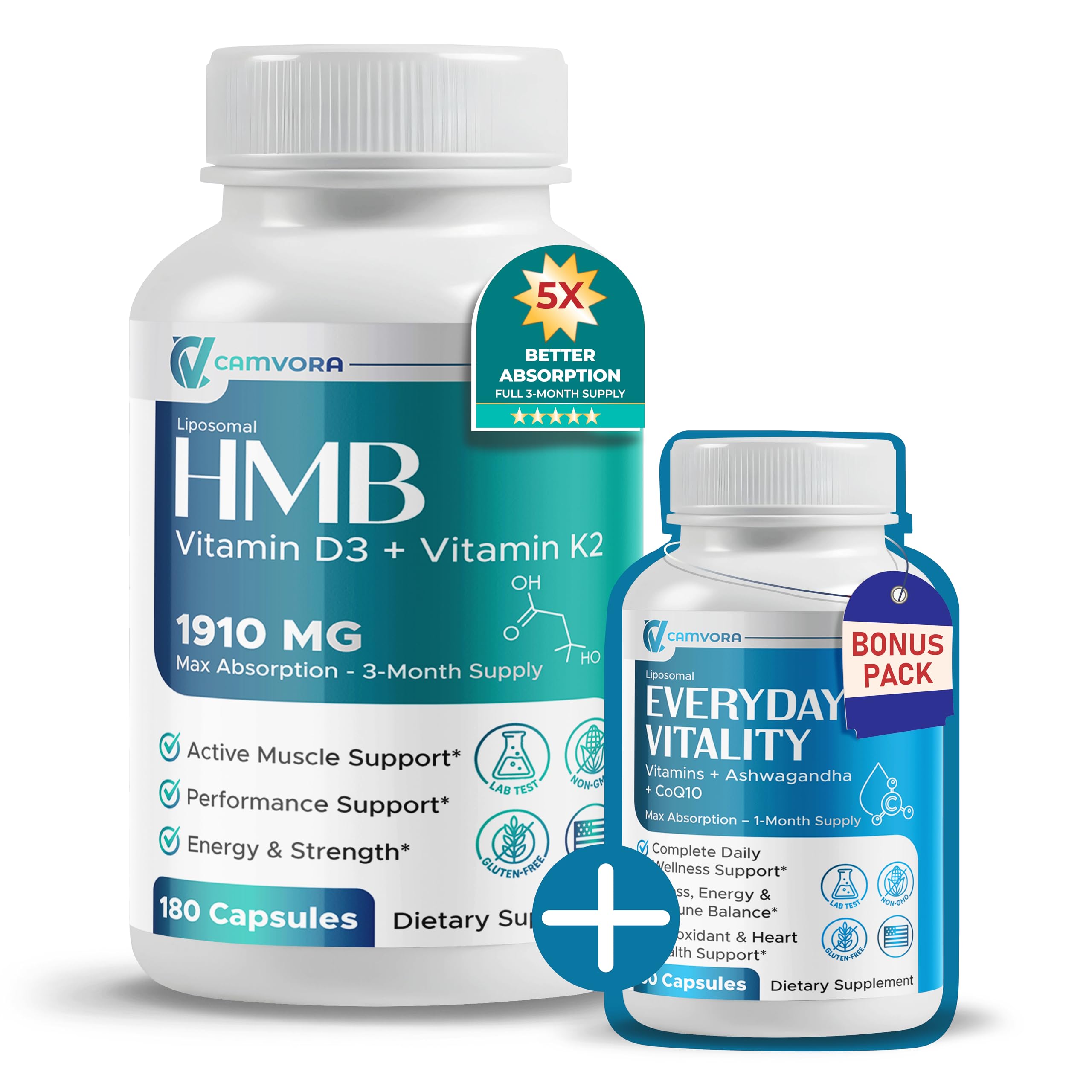 Camvora Liposomal HMB with Vitamin D3 K2 is made to support strength, recovery, and daily performance. With science-backed ingredients and advanced absorption, it helps you get real results. Preserve Lean Muscle HMB helps slow muscle breakdown and supports retention of lean mass. Perfect for athletes or adults who want to stay active and strong. Boost Energy Endurance Creatine and amino acids provide lasting stamina and reduce fatigue. This helps you perform better during training and daily activities. Faster Recovery Adaptogens like Tongkat Ali and Eleuthero support quicker recovery after exercise. Less soreness means faster return to action. Superior Absorption Liposomal delivery ensures nutrients are absorbed efficiently, giving your body more of what it needs. Produced in a GMP-certified, non-GMO, gluten-free, and third-party tested for safety. Take 2 capsules daily with food to stay strong, energized, and confident.