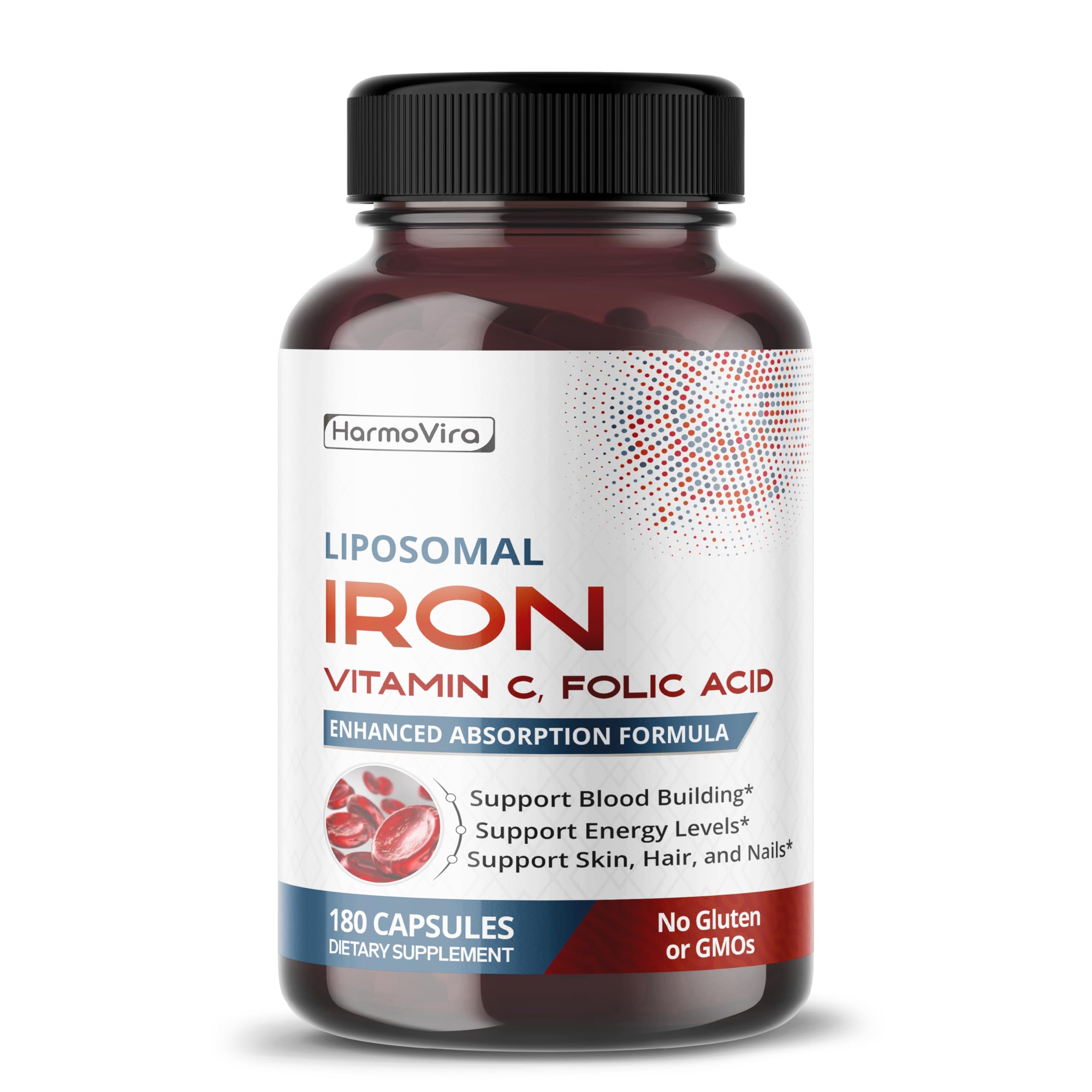 Daily Iron Support – With Vitamins that Work Together. HarmoVira Liposomal Iron combines gentle Iron Bisglycinate with Vitamin C, Folic Acid, and a blend of B Vitamins to help support red blood cell formation and maintain daily energy levels. Liposomal technology enhances absorption, making it ideal for those looking for a more efficient and well-tolerated iron supplement. Each capsule is carefully formulated for daily use and is free from gluten, GMOs, and artificial fillers. Whether you're looking to support your nutritional intake or maintain general wellness, HarmoVira Iron fits into your routine with ease.