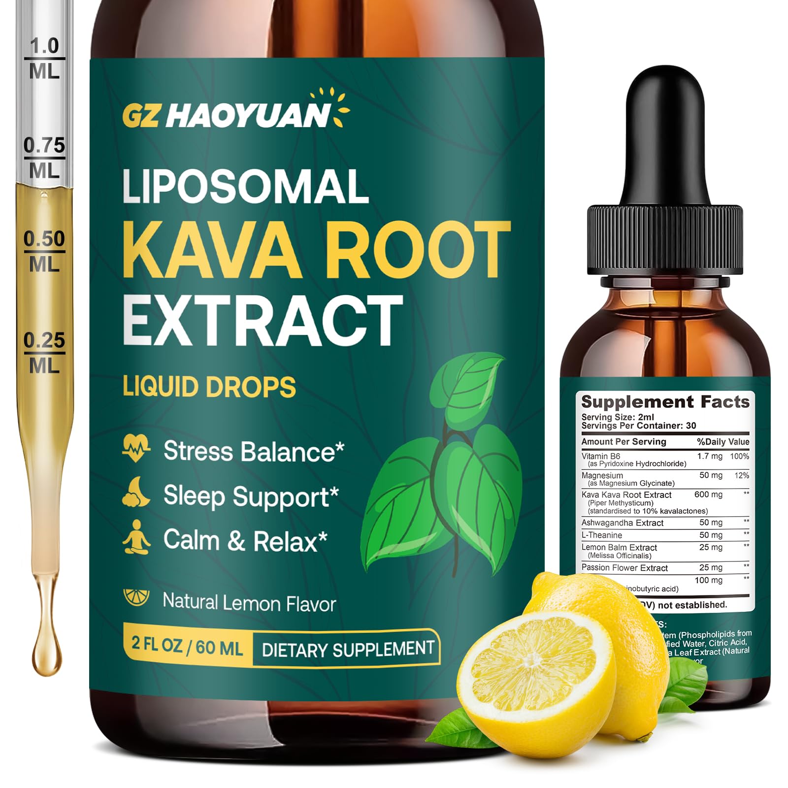 Pure Trusted Wellness – Vegan, non-GMO, sugar-free. Each 2 fl oz bottle of gluten-free drops provides a 30-day supply. Our factory strictly follows production standards to ensure product quality. If you have any questions or concerns, we are here to help you . Easy to Take, Easy to Absorb – Not a fan of large pills? This lemon-flavored Liposomal Kava support comes in a convenient liquid form. Simply take 2 full droppers daily, just mix it with water, add to smoothies, or place directly under your tongue. Liquid supplements are not only easier to take, but they are also absorbed more quickly and efficiently into the bloodstream than capsules or tablets, offering superior bioavailability for faster, more effective support . Liposomal Delivery with GZ HAOYUAN Liquid Kava – Our advanced liposomal encapsulation helps you enjoy all the calming benefits of Kava, without the traditional bitterness, gritty texture, earthy aftertaste or numbing mouthfeel. Just a smoother, cleaner experience that fits effortlessly into your daily wellness routine . Cognitive Focus Support – Enhanced with adaptogens like Ashwagandha and L-Theanine, this kava drops may help ease mental fatigue while promoting mental clarity and focus. A great option for those seeking natural support for concentration and a calm mind . Stay Balanced, Feel Better – Infused with Kava, GABA, L-Theanine, and Lemon Balm, this kava extract supports neurotransmitter balance and a more positive mood. Together, they help modulate dopamine and serotonin activity, key to maintaining emotional well-being during times of stress . Feel Calm Relaxed in Every Drop – Our advanced KAVA liquid features 600 mg of Kava Kava Root Extract, standardized to 10 kavalactones, a powerful natural compound known to support a healthy stress response and promote deep relaxation. Perfect for winding down after a long day, it helps you feel calm, centered, and emotionally balanced .