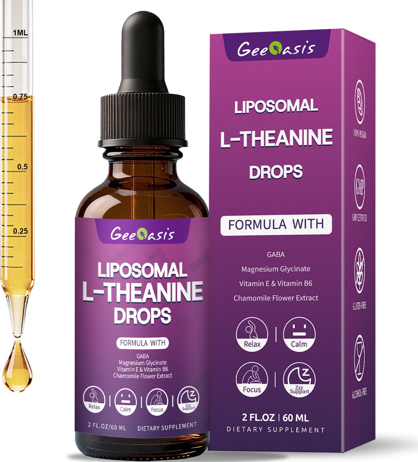 Liposomal L-Theanine with GABA Liquid Drops Theanine 400 mg Supplement for Kids & Adults with Magnesium Glycinate Chamomile Flower Vitamin E & B6 Stress Relief zzZ & Relaxation Support 2 FL OZ