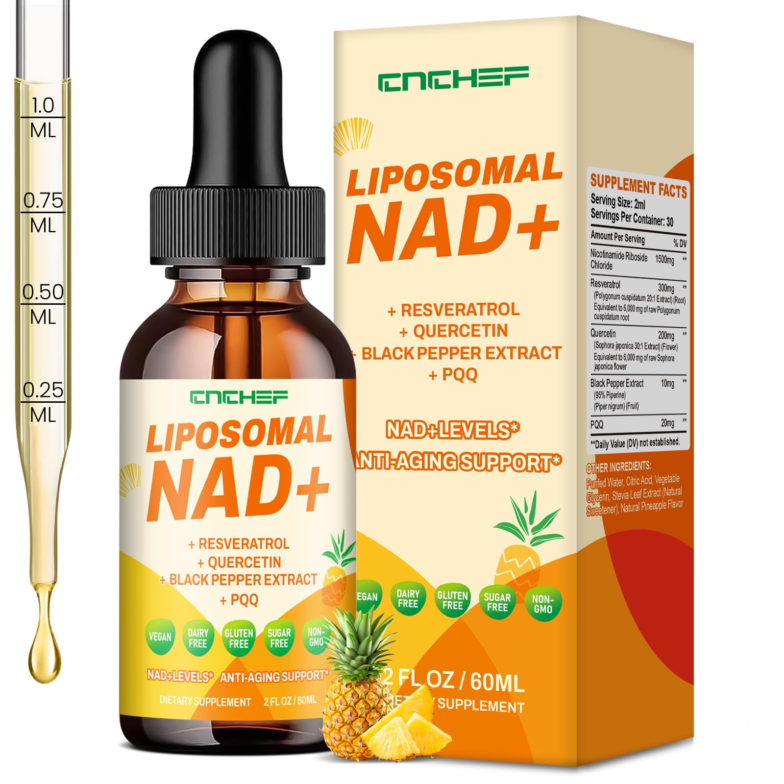 EACH BATCH IS INDEPENDENTLY TESTED: Our NAD resveratrol supplement is all-natural, non-GMO, gluten-free, and contains no harmful chemicals. If you have any questions or concerns, we are here to assist you. CLINICALLY OPTIMIZED COMPLEX: Each serving packs 20mg PQQ (pyrroloquinoline quinone) to stimulate mitochondrial biogenesis, working synergistically with 1500mg NAD and 300mg resveratrol. Studies show this combination enhances cellular energy output by 40 while activating longevity pathways (sirtuins). MAXIMIZE BIOAVAILABILITY DELICIOUS: Adding 10 mg of black pepper extract (95 piperine) increases absorption efficiency by 30 . Our pineapple-flavored NAD drops can be taken sublingually or with water and absorbed directly into the bloodstream, avoiding interference from digestive enzymes - proven to be absorbed 2.7 times faster than traditional capsules (based on in vitro studies). ANTI-AGING: NAD is an important coenzyme. As we age, NAD levels naturally decline, leading to decreased energy, cognitive function, and overall vitality. These NAD supplement are designed to help boost NAD levels to help you fight fatigue, promote healthy aging, and support optimal cellular function. NUTRIENT-PACKED REASONABLE FORMULA: Each 2ml serving delivers?1500mg Nicotinamide Riboside Hydrogen Malate, synergized with?300mg Resveratrol and 200mg Quercetin. This triple-action formula supports mitochondrial energy production, DNA repair, and antioxidant defense, backed by a ?30-day supply? of fast-absorbing liquid drops.